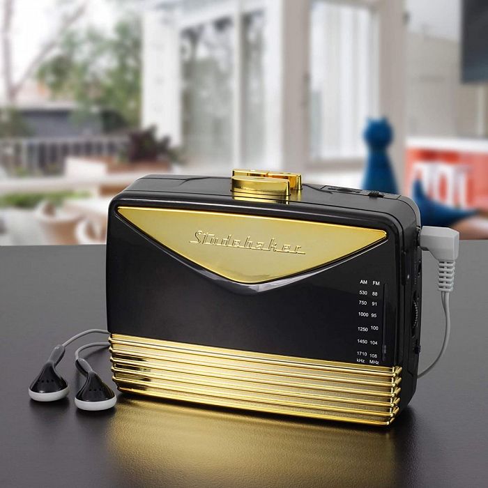 Симпатичный кассетный плеер, выпускающийся в нескольких цветах. Вариант черно-золотого цвета – просто лучший друг модных парней! Роскошный внешний вид, стилизация под 1950-е годы, входящие в комплект батарейки, надежная клипса для крепления на одежде – что еще нужно для полного счастья? Разве что перемотка в обратном направлении, но ее добавить забыли… Кстати, для девушек эта же модель выпускается в розово-золотой расцветке.