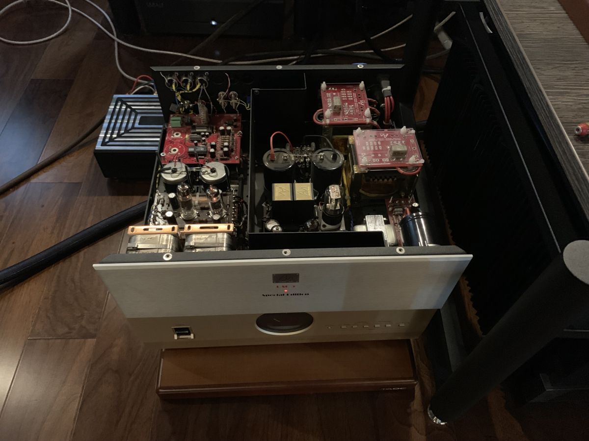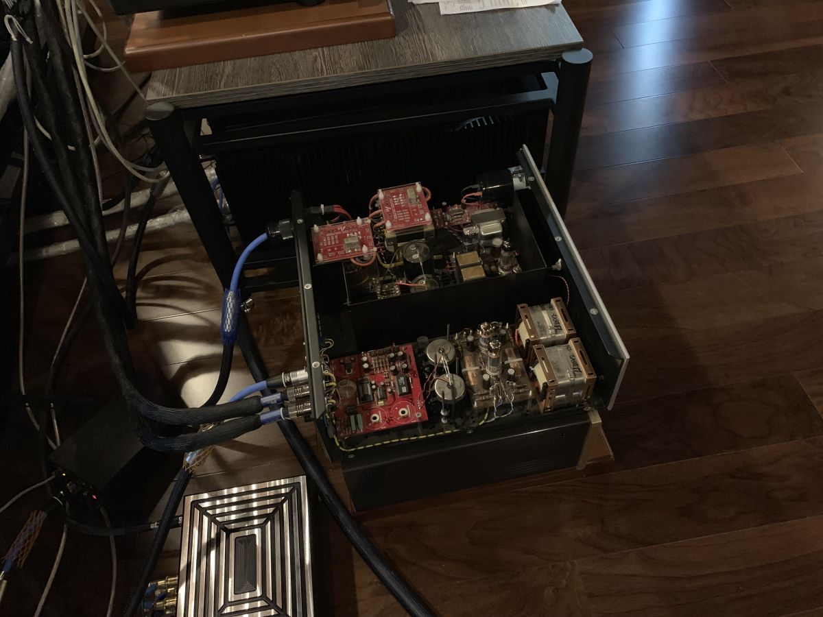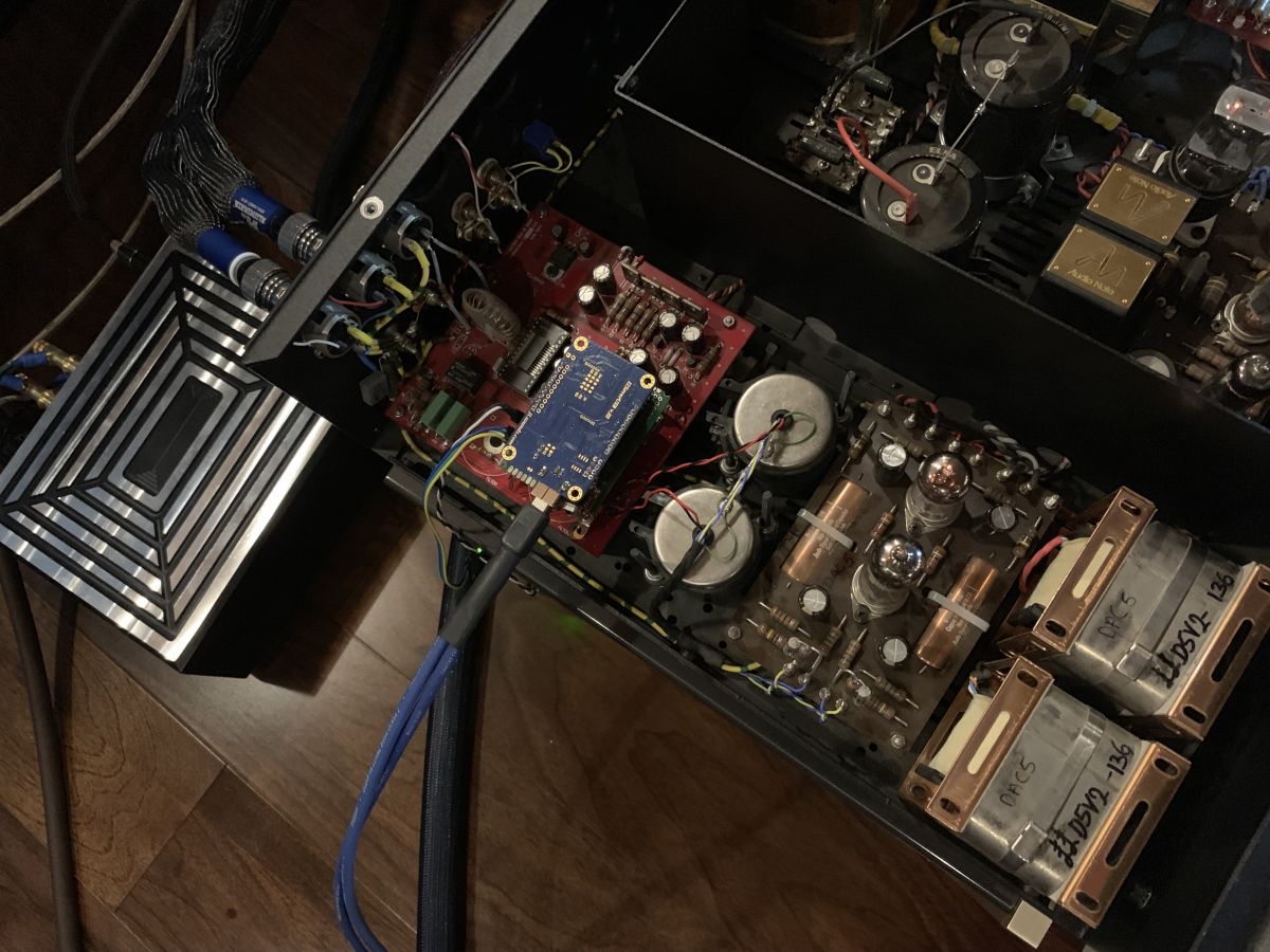 Audio Note DAC5 Special – прямая противоположность. Микросхема Analog Devices AD1865N работает до параметров 18/96. «С завода» аппарат может принимать лишь PCM, MP3 и WAV – да и то, только по «классическим» входам (до AES/EBU). Зато, у него куча ламп (1 x 5814a, 1 x 6463, 1 x OB2, 1 x ECL82, 1 x 6X5), двойные блоки питания для аналогового выходного каскада (класс А), серебряные провода и трансформаторы, угольнопленочные резисторы Audio Note, конденсаторы Black Gate WKz, N и Nx. Есть небольшая хитрость: если вам очень нужен именно USB-вход, микросхему Xmos можно установить без пайки – просто на коннекторы на плате и вывести провод (или разъем) на заднюю панель (отверстия тоже намечены). Впрочем, качество саунда через такое включение будет хуже – не даром Питер Квортруп избегает USB. Для схемы Audio Note DAC5 Special лучше включаться по AES/EBU (что мы и сделали – использовав Moon 180).
