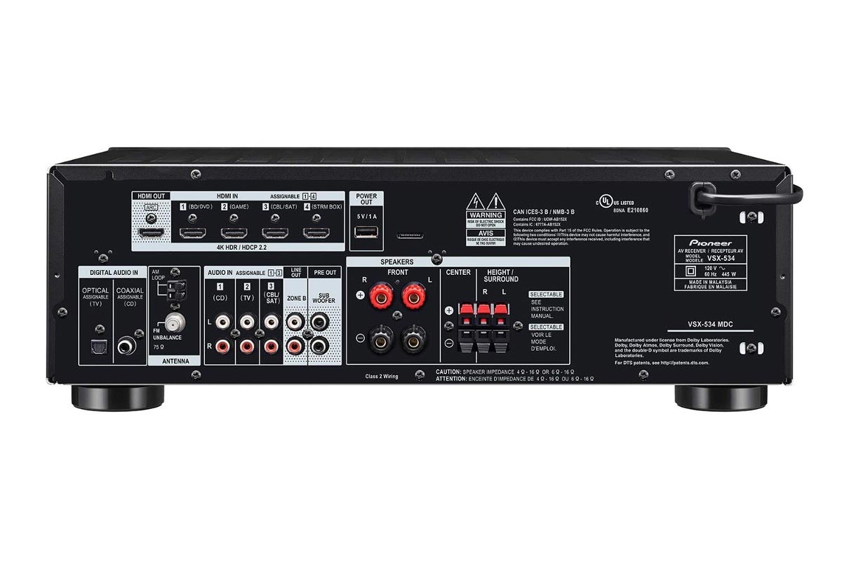 Как и все модели этой подборки, AV-ресивер Pioneer VSX-534 оснащен пятью каналами усиления, что позволяет организовать на его базе систему окружающего звучания в классической конфигурации 5.1. Отличительной особенностью этого ресивера стала поддержка новых форматов окружающего звучания Dolby Atmos и DTS:X – при этом для обслуживания двух верхних АС используются усилители тыловых каналов, то есть, реализуется конфигурация 3.1.2. Кроме того, есть возможность эмуляции верхних каналов средствами DSP – в этом случае удастся сохранить тыловую акустику. Фирменная система автокалибровки MCACC оптимизирует звучание в зависимости от акустических особенностей помещения и характеристик колонок. Видеотракт Pioneer VSX-534 поддерживает все самые современные форматы видео, включая 4K HDR и Dolby Vision. Свежая версия Bluetooth позволяет транслировать на ресивер музыку непосредственно со смартфона или планшета. Есть на задней панели ресивера и порт USB, но предназначен он лишь для обновления прошивки.