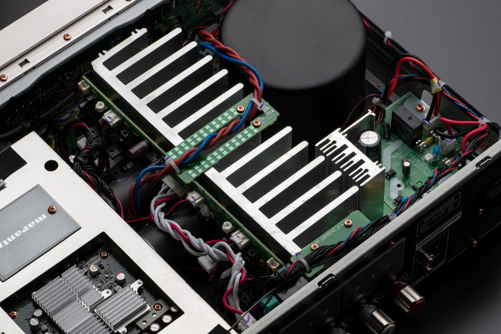 Внутреннее строение аппарата традиционно – по центру расположен радиатор, делящий объем на две части. В одной из них находится солидный тороидальный трансформатор, надежно экранированный металлическим кожухом, в другой – все аналоговые и цифровые цепи, включая процессор и ЦАП. В каскаде предварительного усилителя установлены фирменные сборки на дискретных элементах HDAM (Hyper-Dynamic Amplifier Module) версии SA3, выходные каскады реализованы с применением обратной связи по току, что потенциально обещает хороший контроль акустических систем. Заявленная мощность – 60 Ватт при нагрузке 8 Ом, весит аппарат 10,3 килограмма.