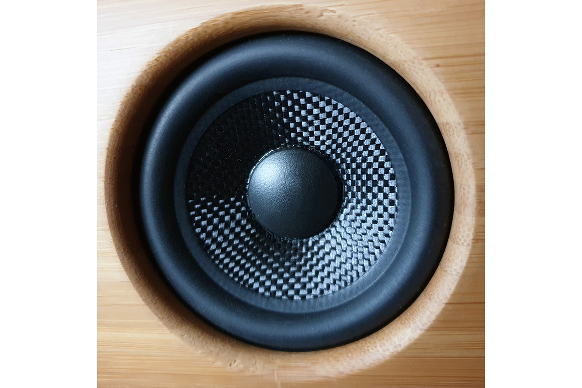 Поставляется колонка в симпатичной и аккуратной коробке с лаковой выборочной печатью фотографий устройства. При создании внешнего облика модели дизайнер явно вдохновлялся аудиотехникой 1960-х годов, а именно стереофоническими консолями того периода. Об этом говорят как четыре серебристые конусообразные ножки, так и фронтальная стенка из массива дерева. Да-да, из массива, в качестве которого выступает наборная панель из бамбука, в которой прорезаны круглые отверстия для трех динамиков. Основную часть диапазона озвучивают два широкополосных драйвера с диффузорами диаметром 50 мм из плетеного стекловолокна, а за бас отвечает 75-мм динамик с диффузором из того же материала на широком резиновом подвесе. Дополнительный вес низкочастотному диапазону призван придать овальный пассивный радиатор, занимающий большую часть задней панели и дополнительно утяжеленный планкой из бамбука.