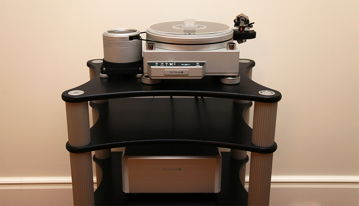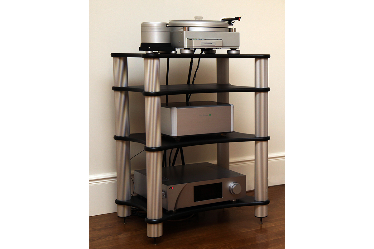 Достаточно просторный зал имеет выделенную зону для прослушивания. В ней была размещена стойка Solid Tech Radius Solo 4: простое, эффективное и стильное решение для развязки электроники от пола и устранения вибраций. Венчает многоэтажную конструкцию проигрыватель виниловых дисков TechDas AirForce III – конечно же, с фирменными технологиями управления воздушным потоком, воздушным подшипником и вакуумным прижимом диска. Внешний блок помпы обеспечивает левитирование опорного диска и выдающуюся точность скорости вращения (привод – пассиковый, двигатель рядом отдельно от стола).