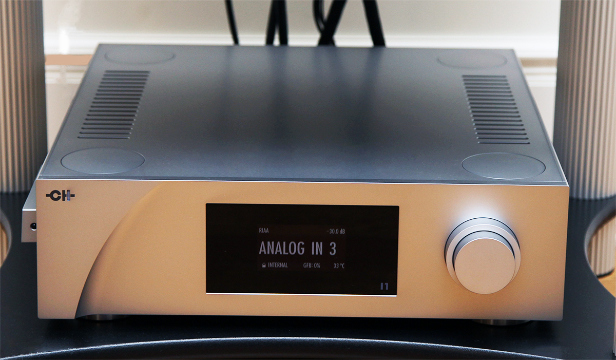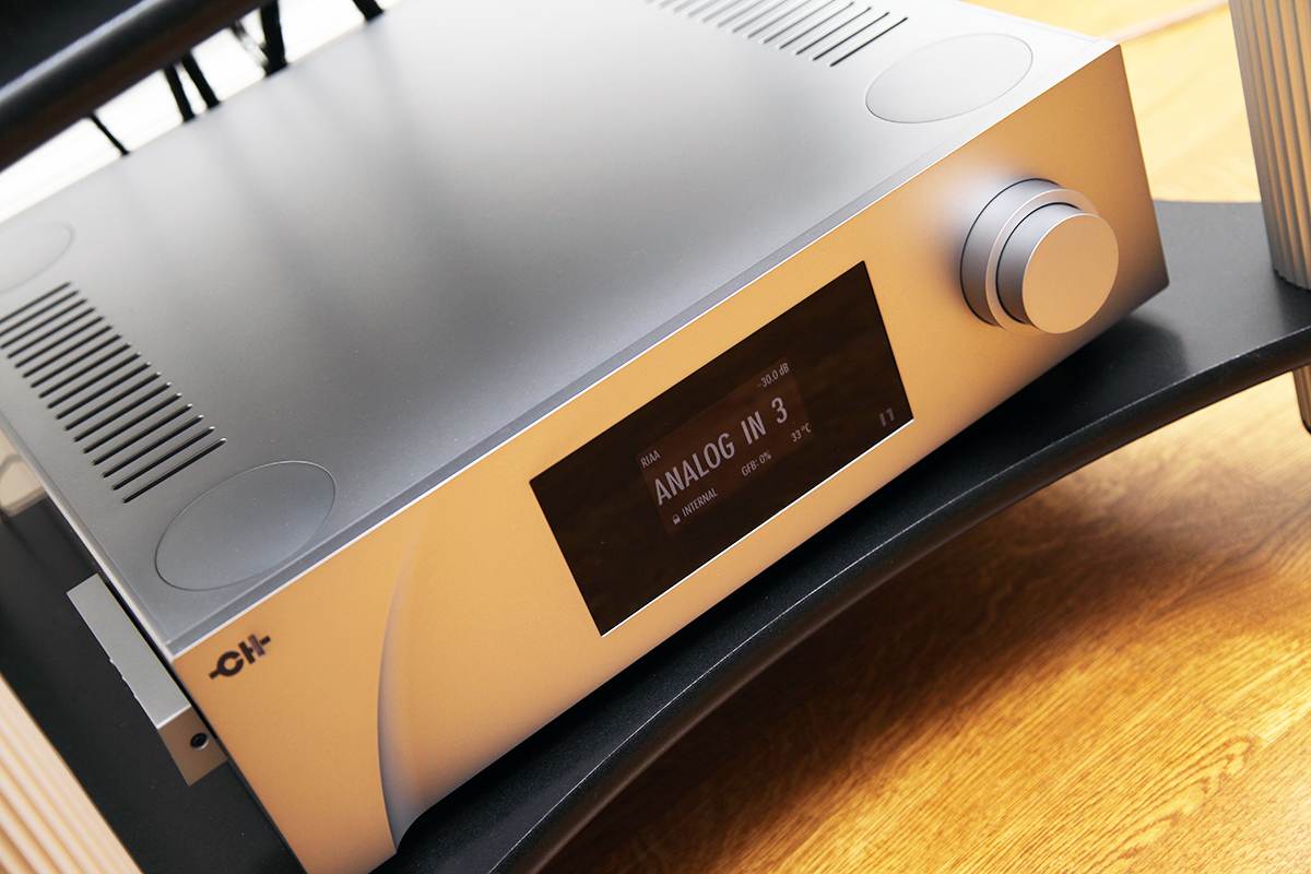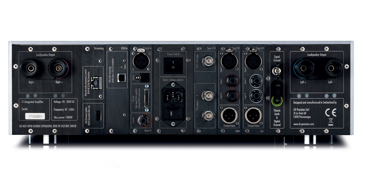 Весь остальной функционал системы сконцентрирован в интегральном усилителе CH Precision I1 – с опциональными платами фонокорректора (Phono_I1) и сетевого стримера (Ethernet_IN). Усилитель обеспечивает 2 х 100 Вт мощности на нагрузку номинальным сопротивлением 8 Ом или 2 х 175 Вт на 4 Ом, масса аппарата 33 (!) кг – все очень серьезно. Львиная доля веса приходится на огромный тороидальный силовой трансформатор, обеспечивающий мощность, отдаваемую блоком питания, на уровне 1 000 VA. При этом, ёмкость батареи конденсаторов фильтра достигает 100 тысяч мкФ.