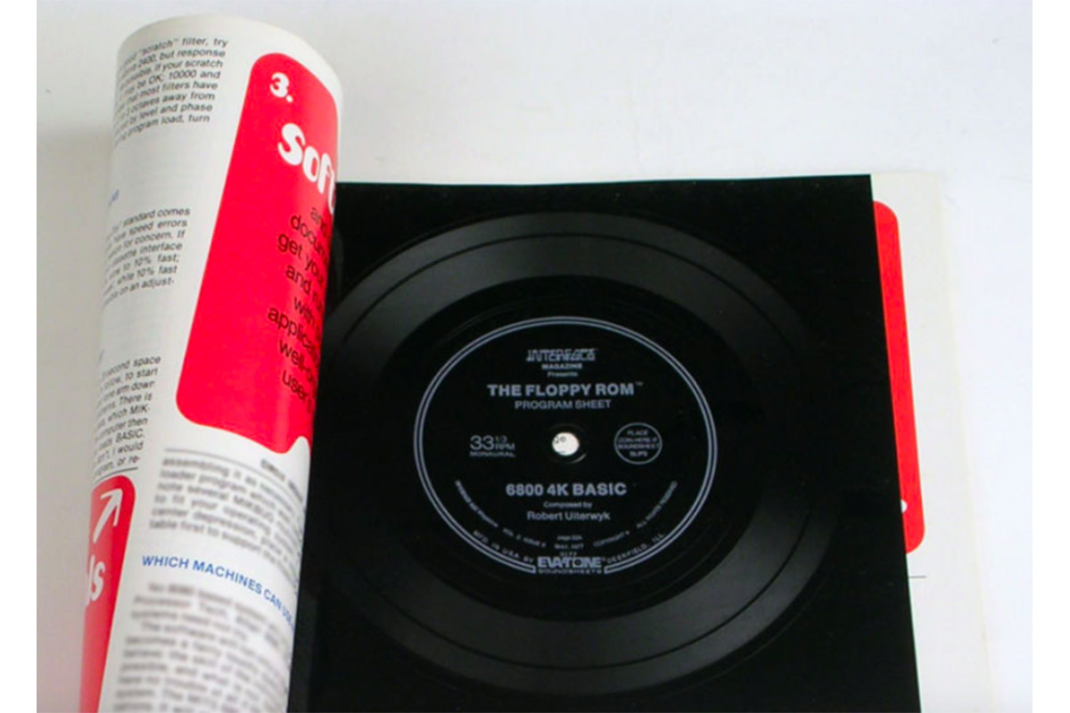 Наконец, во второй половине 70-х годов прошлого века гибкие пластинки в виде приложений к специализированным печатным изданиям использовались даже для тиражирования программ для набирающих в то время популярность первых действительно персональных компьютеров ZX Spectrum, Commodore 64 и других. Гибкая пластинка, записанная со скоростью вращения 33⅓ об./мин., вмещала до 4 Кб данных, а для загрузки информации в компьютер, оснащенный лишь ленточным приводом, содержимое пластинки необходимо было переписать на аудиокассету.