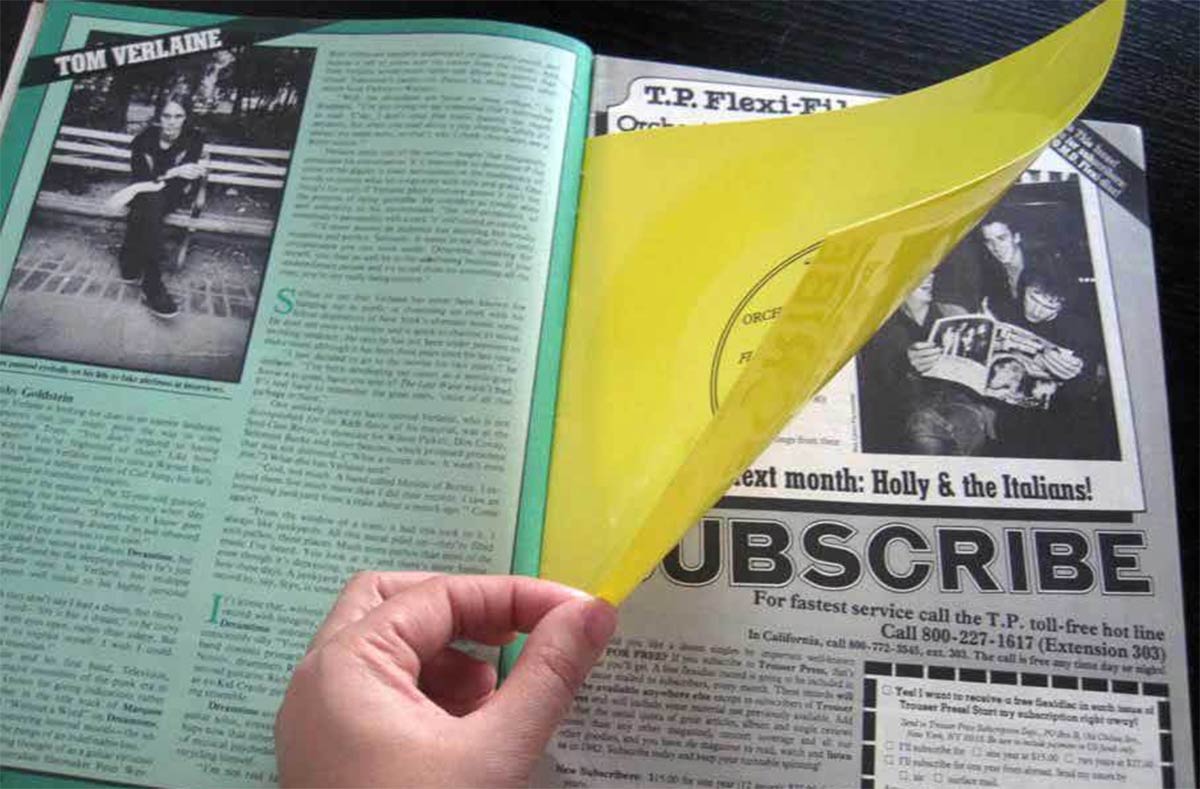Итак, в 1962 году компания Evatone патентует гибкую пластинку под фирменным названием «Evatone Soundsheet». В процессе производства используется поливинилхлорид – на плёнке из этого материала отпечатывается звуковая дорожка. Такие пластинки были не только гораздо легче виниловых дисков, требовали меньше материала для своего производства и, как следствие, отличались низкой себестоимостью, но и позволяли за счет гибкости сопровождать аудиозаписями печатную продукцию – пластинки просто вкладывались между страницами журнала. В результате, этот формат идеально подходил для различных промо-акций, рекламы и аудиоприложений к журналам.