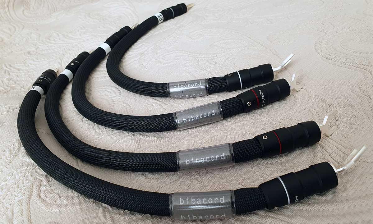 Акустические кабели Bibacord Speaker (11 480 евро за 2,5 метровую пару) имеют в своем составе несколько медных и серебряных моножил, изготовленных методом непрерывного вытягивания OCC (Ohno Continuous Cast) и представляющих собой, по сути, единый кристалл. Использование монокристаллических проводников обычно благотворно сказывается на качестве звучания, хотя и не является гарантией. Общее сечение жил в каждом проводе акустической пары составляет 4,73 мм2 или 9,46 мм2 на канал.