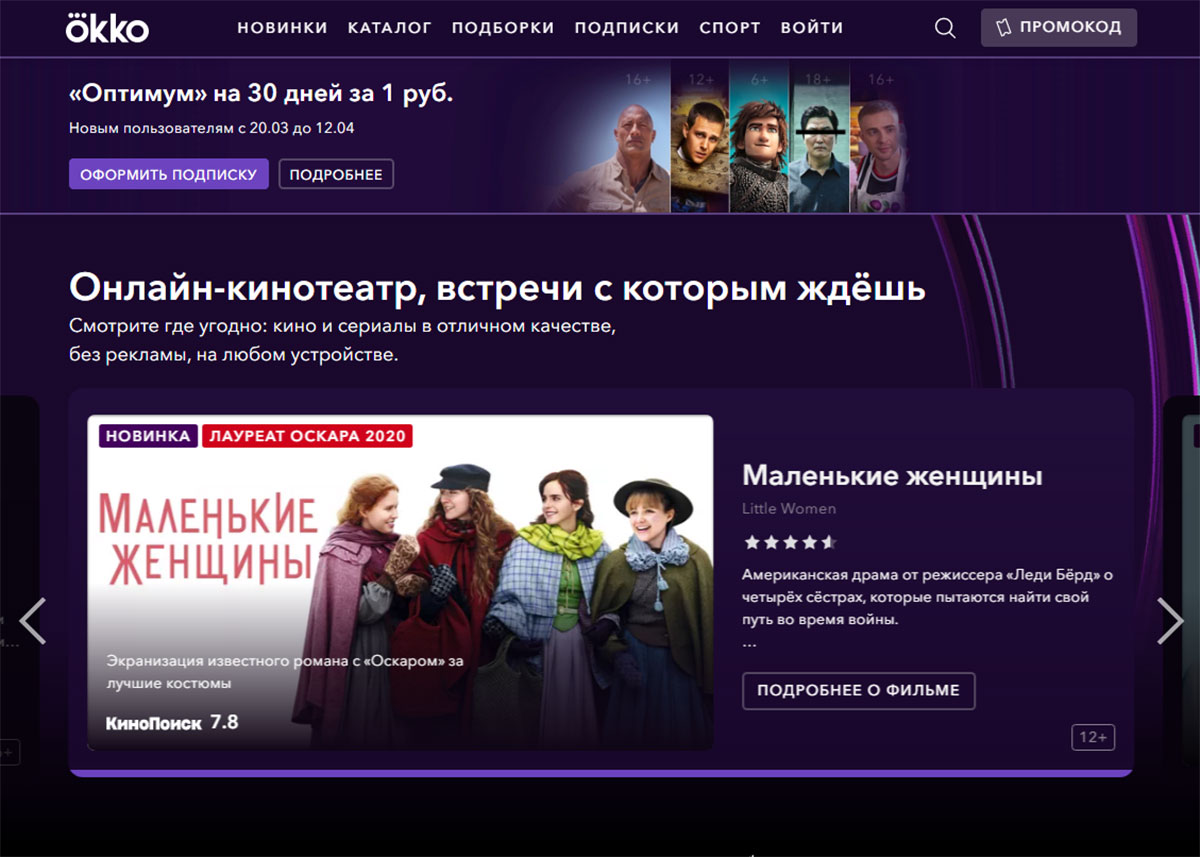В прошлом году онлайн-видеосервис Okko сделал неожиданный шаг, наверняка расширивший его аудиторию – этот кинотеатр приобрел эксклюзивные права на трансляцию одного из самых престижных спортивных соревнований – матчей английской футбольной лиги. Увы, эпидемия лишила зрителей спорта, однако оставила открытым окно в мир кино – у Okko с этим тоже полный порядок. Доступ к обширной библиотеке фильмов, сериалов и познавательных программ дает подписка, в различных вариантах стоящая от 399 рублей, однако в ближайшие недели оформить ее можно всего за один рубль с последующим предоставлением 50% скидки на следующий месяц просмотра. Сервис славится своими подборками, которые удовлетворят самых взыскательных зрителей – например, поклонников серьезных драм, вроде отмеченных «Оскаром» «Маленьких женщин» Греты Гервиг.