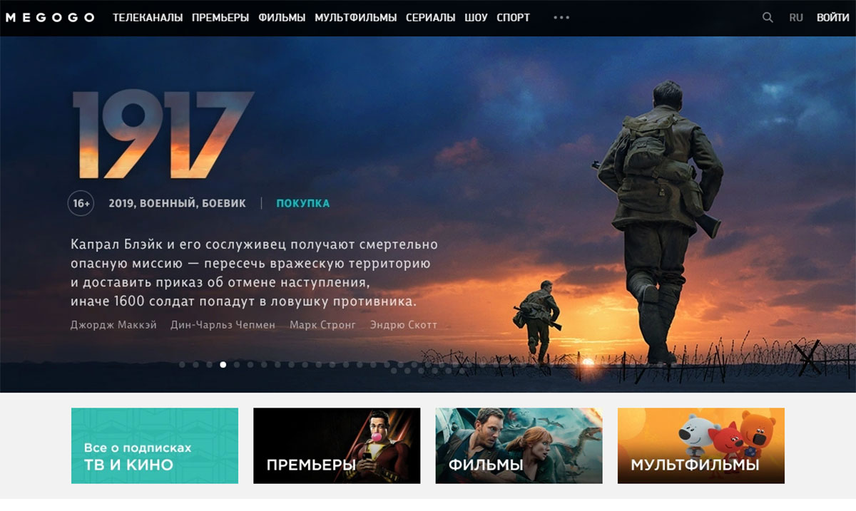 Весьма заметным преимуществом онлайн-видеосервиса Megogo является то, что эта компания самостоятельно занимается кинотеатральным прокатом независимых и среднебюджетных картин. Это означает, что видеотека Megogo регулярно пополняется эксклюзивными зарубежными лентами самой разной направленности: от комедий до хорроров. Пользователи сервиса, приобретая подписку, получают не только уникальный фильмовый контент, но и имеют возможность просматривать на нескольких устройствах более двухсот телеканалов, охватывающих интересы любого члена семьи. Стоимость подписных пакетов этого теле- и кинотеатра варьируется от 197 до 597 рублей в месяц, в настоящее время пробный месячный период можно приобрести за один рубль и насладиться, например, военной драмой «1917» в самом высоком качестве с существенной скидкой.