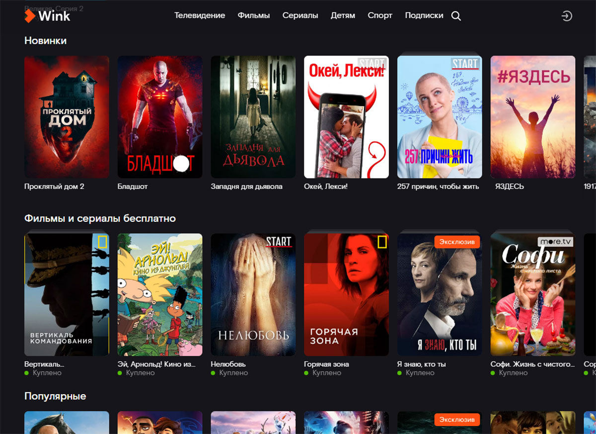 Созданное крупнейшим российским провайдером Ростелеком приложение, получившее название Wink, обладает широчайшим функционалом. Подписчики Wink получают доступ к внушительному перечню телеканалов на любой вкус, обширной коллекции фильмов и сериалов, а кроме того здесь предлагаются дополнительные пакеты программ и передач для детей, школьников, тех, кто обучается английскому языку и даже для фанатов караоке. Сервис предоставляет гибкую систему оплаты, в которой пользователь сам подбирает для себя интересные пакеты – попробовать это удовольствие можно совершенно бесплатно. Видеотека Wink пополняется очень оперативно, но и о настоящих проверенных временем хитах здесь не забывают – уже сейчас сервис дает возможность посмотреть свежайший боевик «Бладшот» или пересмотреть все части «Человека-паука».