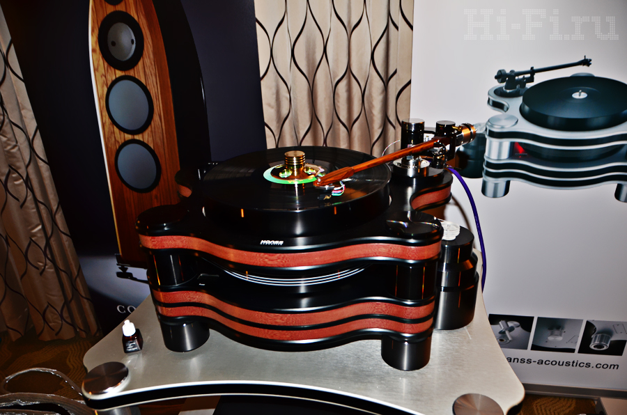 В проигрывателе виниловых дисков Hanss Acoustics T-60 применена многослойная конструкция из бакелита, нового материала, призванного подавлять нежелательные вибрации. Между слоев интегрирована специальная регулируемая магнитная подвеска, позволяющая задавать высоту опорного диска. Вертушка укомплектована деревянным (!) тонармом Durand Talea с картриджем Ortofon Winfeld.