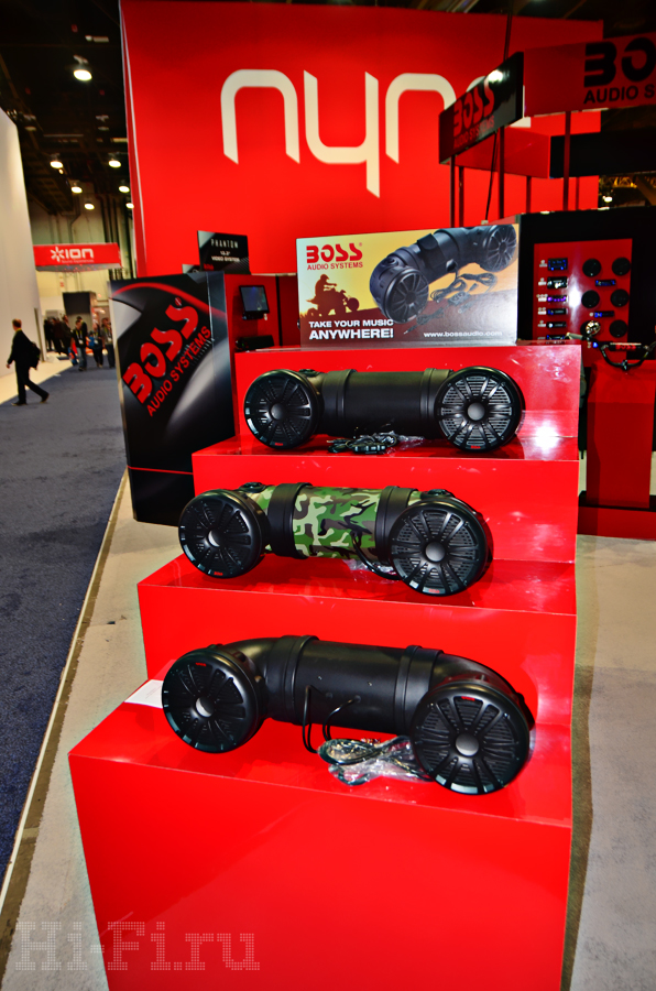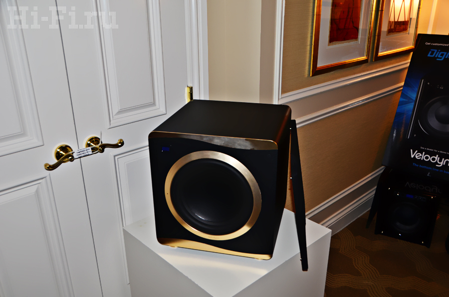 На выставке компанией Velodyne была представлена беспроводная серия Wi-Q, состоящая из двух моделей – с 10- и 12-дюймовыми драйверами. Обе модели оснащены системами автоматической настройки звучания под акустические особенности помещения, беспроводная передача сигнала реализована посредством фирменной системы WiConnect. Встроенный в сабвуфер усилитель способен выдать 195 Вт мощности (RMS) для десятидюймовой модели и 225 Вт (RMS) для модели с излучателем диаметром 12 дюймов. На фото – сделанный по спецзаказу сабвуфер серии EQ-MAX в «золотой» отделке.