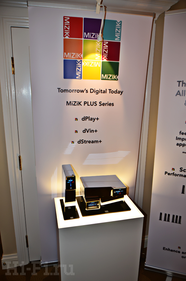 Свежеобразованная компания MiZiK представила на суд посетителей линейку из стримера/сервера dStream, предварительного усилителя/ЦАП dPlay и фонокорректора dVin. Компактные компоненты поддерживают работу с аудиопотоком формата PCM с параметрами вплоть до 32 бит / 384 кГц и DSD. ЦАП оснащен коаксиальными/оптическими и USB-входами, подключение компонентов друг к другу осуществляется по фирменной шине MiZik Link. dStream на момент начала продаж будет поддерживать аудиопоток с разрешением до 24 бит / 192 кГц и DSD, позже посредством обновления ПО обещают добавить поддержку разрешения 32 бит / 384 кГц и DXD. Кроме того, устройство имеет отсек для жесткого диска формата 2,5-дюйма.