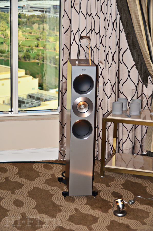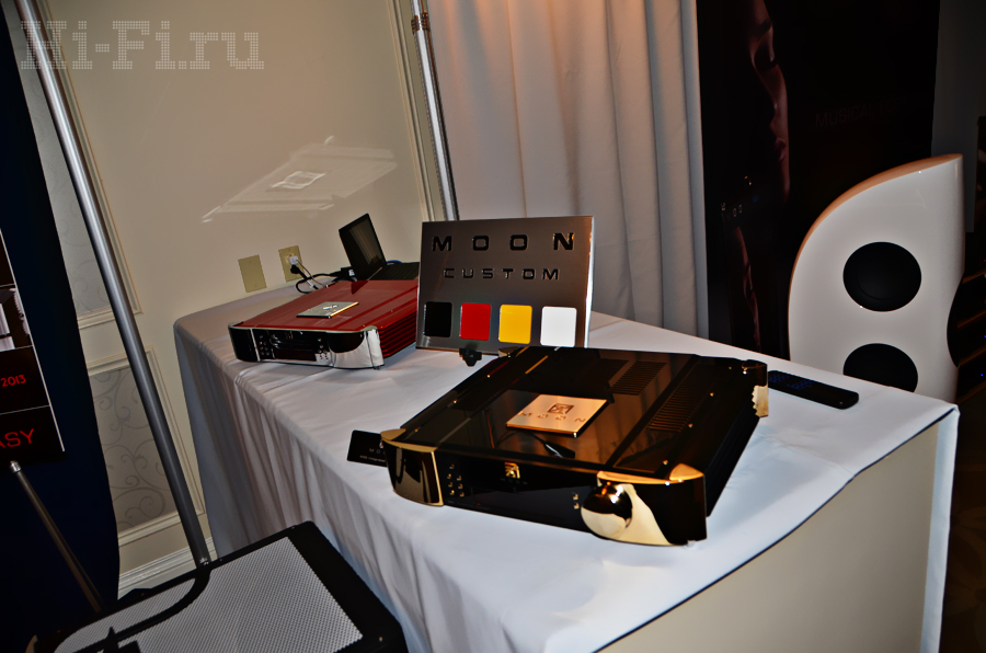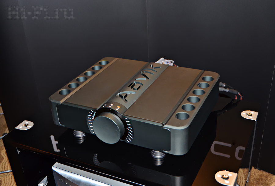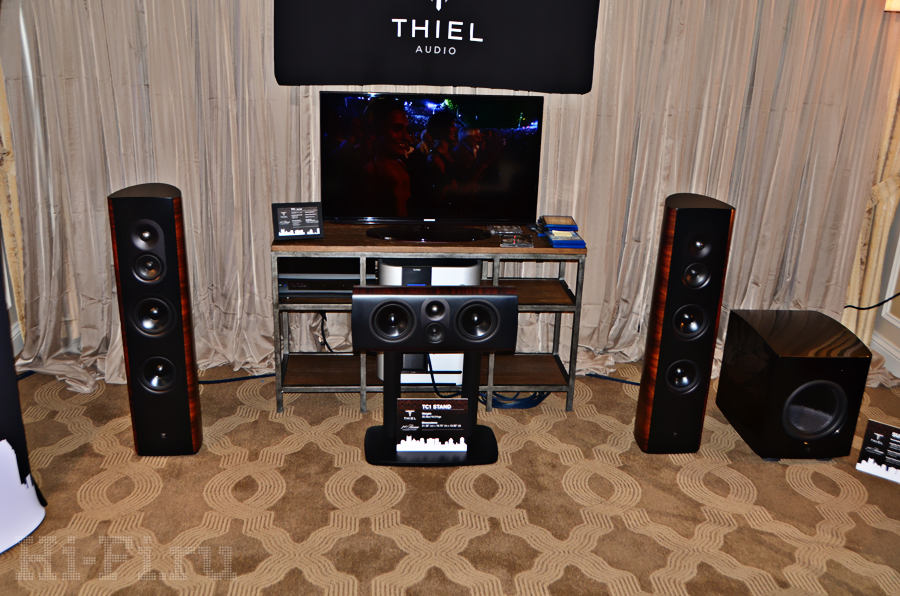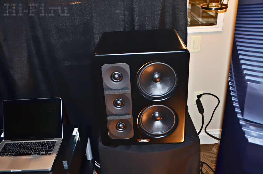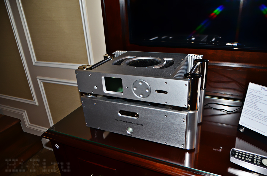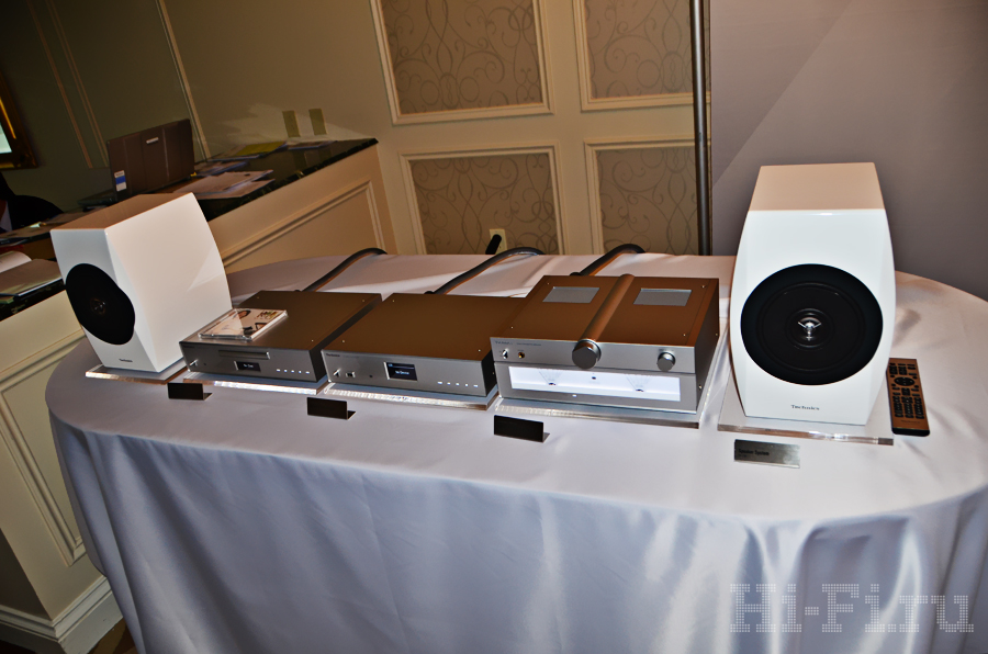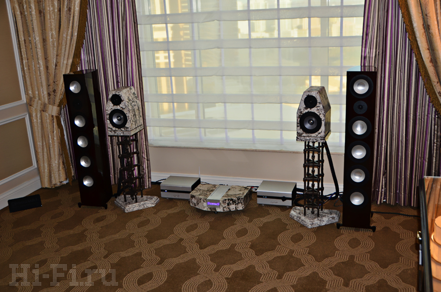 Американцы из компании Thiel показывали как стерео, так и многоканальную систему на базе внушительных акустических систем ТТ1 (напольная модель), TC1 (АС центрального канала), TM3 (полочники) и сабвуфер. Последний так и называется – просто «сабвуфер», внутри которого скрыт 1 кВт мощности, способного в пике развернуться до двух киловатт! Что интересно, завлекали на стенд демонстрацией многоканальной системы с многоканальным же музыкальным (!) материалом.