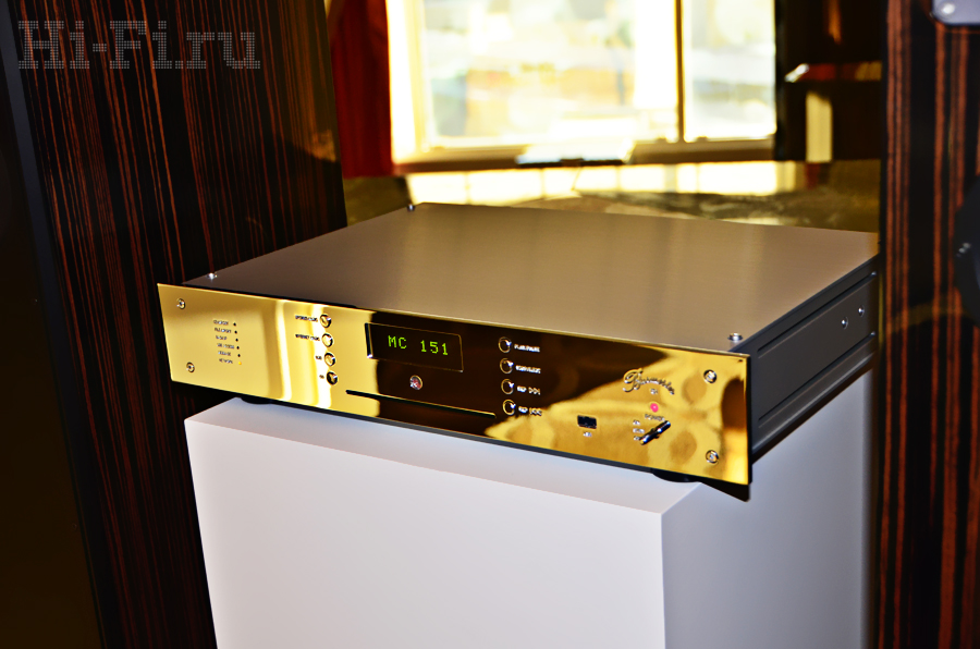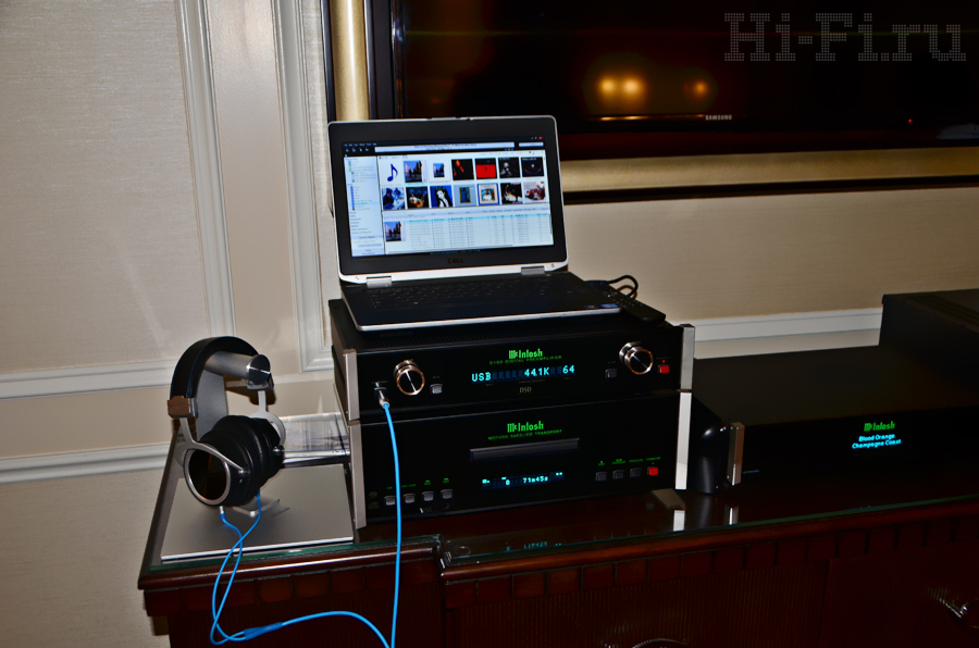 На стенде компании McIntosh внимание привлек цифровой предварительный усилитель со втроенным ЦАП с индексом D150 (сверху). Аппарат оснащен обычными и балансными выходами, а также встроенным усилителем для наушников. ЦАП способен обрабатывать сигнал с параметрами вплоть до 32 бит / 384 кГц, понимает DXD 352,8/384 кГц и DSD 64/128 через интерфейс USB. Подключение транспорта MCT450 (внизу) позволяет напрямую получать данные с CD/SACD через фирменный интерфейс.
