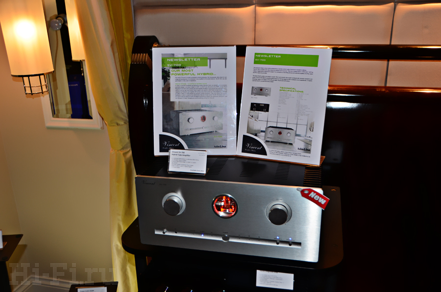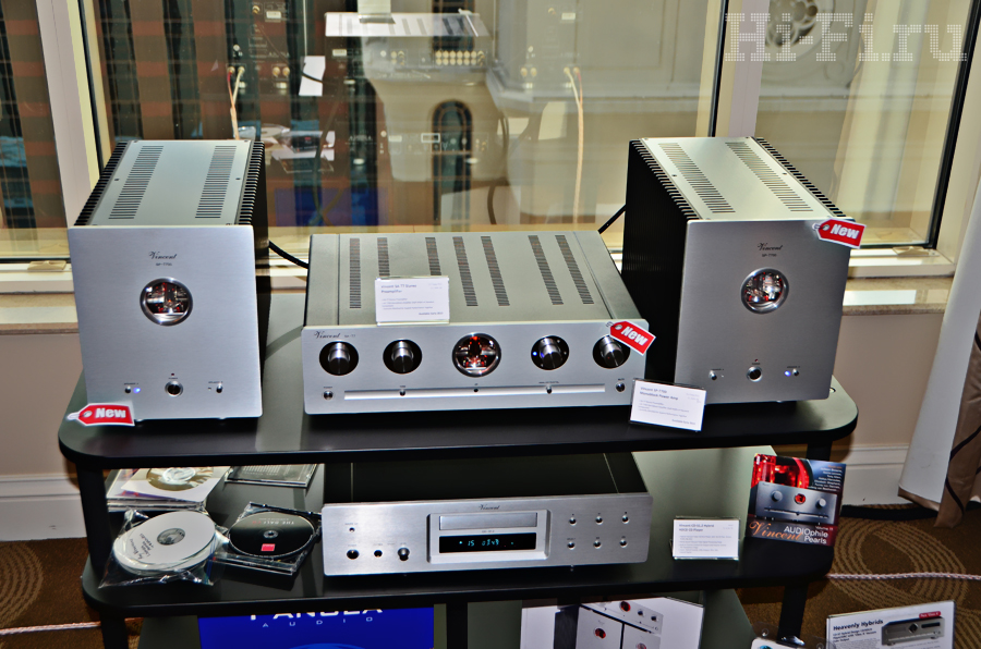 Немцы из Vincent привезли на выставку сразу несколько новинок, и одни из очень немногих, кто потрудился выделить эти новые модели в экспозиции, за что им большое человеческое спасибо. Итак, гибридный ламповый усилитель Vincent SV-700 оснащен как аналоговыми (XLR/RCA), так и цифровыми (оптический и коаксиальный) входами, рассчитан на подключение двух пар акустических систем и выдает 2х100 Вт (при нагрузке 8 Ом).