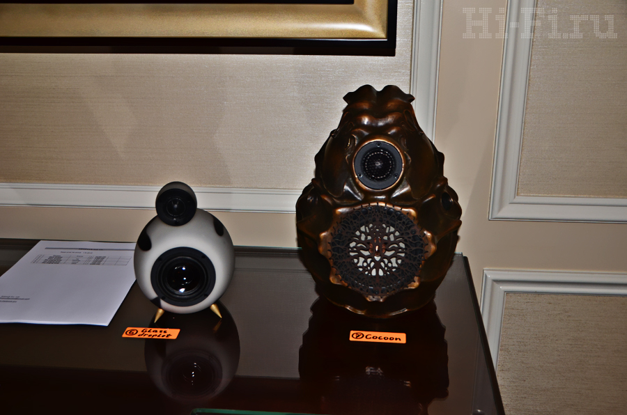 Очень необычно и приятно было встретить на выставке две питерских компании, продвигающие свои собственные очень неординарные акустические системы.Акустические системы Cocoon от АртЗвук сделаны из бронзы и имеют монолитную 18-килограммовую конструкцию, не подверженную резонансам. Выглядят колонки просто потрясающе, а ведь есть еще ограниченная серия в корпусе из серебра. А настоящим ценителям роскоши можно заказать корпуса, покрытые чистым золотом!