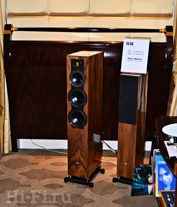 Немецкая компания ELAC демонстрировала свою 400-серию в шикарной отделке «орех». Странно, что на выставке не были показаны активные версии этих акустических систем с приставкой Air-X.