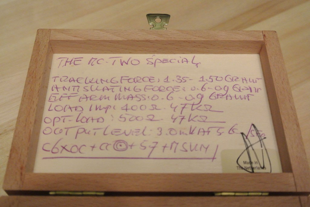 Рекомендуемая прижимная сила – все данные приводятся согласно надписям на коробке – 1,35 – 1,5 грамма, сопротивление нагрузки – от 500 до 47 000 Ом, рекомендуемое значение антискейтинга – 0,6 – 0,9 грамма. Надо сказать, что последнее значение весьма условно, прежде всего из-за разной конструкции компенсаторов скатывающей силы на разных тонармах. Хотя общее правило устанавливать уровень антискейтинга в половину от прижимной силы имеет право на существование, на практике финальную регулировку приходится делать на слух, даже специализированные приборы здесь не всегда помогают. С учетом податливости подвеса в 28х10-6 см/дин и веса картриджа в 8,2 грамма можно говорить о способности van den Hul MC TWO Special успешно работать на любых тонармах, кроме тяжелых. Игла здесь имеет сложную заточку VDH-I с радиусами 3 х 85 микрон, поэтому аккуратное выполнение всех геометрических настроек будет исключительно важным для правильного звука.Кабели