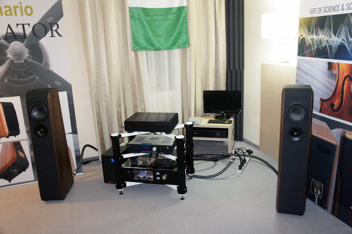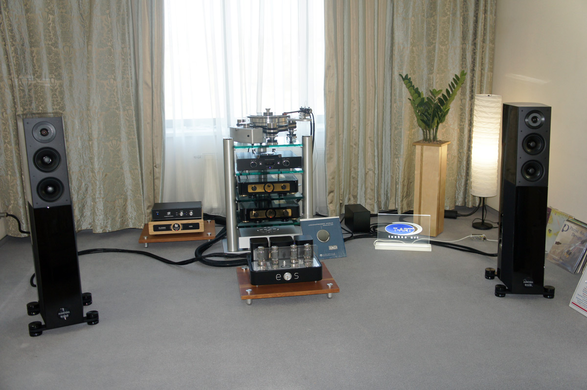 С творчеством Алексея Семина мы хорошо знакомы. На выставке он представил системы в двух весовых категориях. В бескомпромиссном классе неординарный комплект из предварительного усилителя и двух моноблоков Hercules представлен с акустическими системами Rosso Fiorentino Siena. Система дополнена фонокорректором Hercules Phono и даже эквалайзером Lilt производства S.A.Lab. В качестве источников используются проигрыватель виниловых пластинок Michell Orbe SE и CD-проигрыватель TAD D1000.