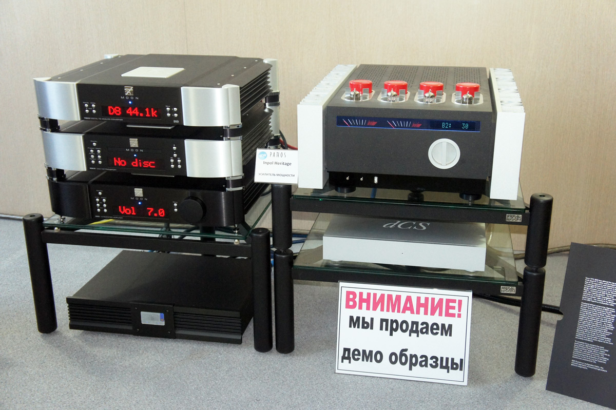 Также в соседней комнате были представлены флагманские акустические системы Concept 500 компании Q Acoustics, отмеченные множеством профильных наград, в том числе от ассоциации EISA как лучшие напольные акустические системы 2017-2018 года. Партнерами для этих исполинов выступили CD-транспорт/ЦАП Moon Evolution 750D, внешний ЦАП Moon Evolution 780D, предварительный усилитель Moon Evolution 740P и двухканальный ламповый усилитель мощности Pathos Inpol Heritage.