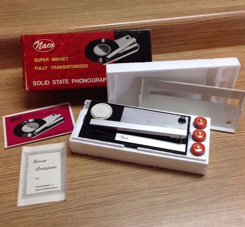 Супер переносной плеер из 1960-х годов. Модель производилась в Японии и продавалась на американском рынке. Важным достоинством ее было то, что вся электроника внутри была транзисторной, о чем свидетельствовала гордая надпись на корпусе Fully Transistorized. Маленькая коробочка включала в себя двигатель с роликовым приводом на опорный диск, миниатюрный усилитель, а также небольшой динамик. Работать Naco TRPH 99 мог как от сети, так и от трех батареек. В наличии были две скорости, 33 и 45 оборотов, так что аппарат мог легко проигрывать и долгоиграющие пластинки. Конечно, о хорошем качестве звука говорить не приходилось, в чем легко можно убедиться, посмотрев ролик.