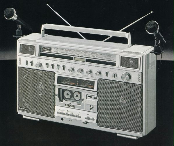 Корпорация Sanyo пережила бурное развитие и расцвет именно 1980-х годах. Она продавала практически все возможные виды бытовой электроники и, конечно, бумбоксы. Одна из топовых моделей фирмы - Sanyo M X824 – отличалась наличием нескольких уникальных функций. Это закрепленный на игле тюнера ЖК-дисплей, на котором в режиме реального времени отображается частота при поиске станции, а также сдвоенные микрофоны на специальных креплениях для записи в стерео. Стрелочные индикаторы и поддержка кассетной декой всех типов пленки дополняют картину.