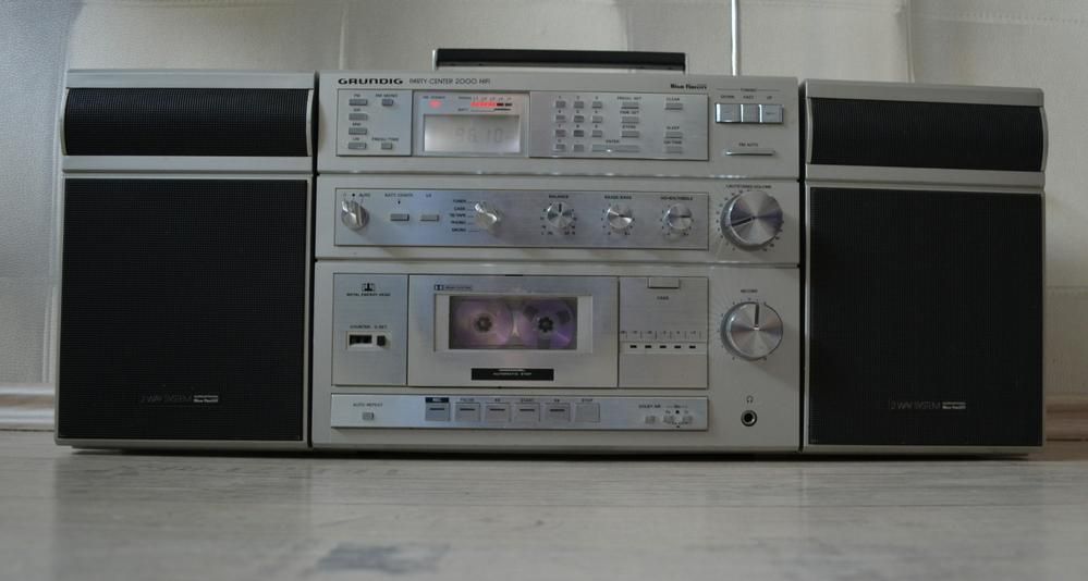 «Фельдшер наш, надомник Рудик, у него приемник Grundig». Думается, о таком геттобластере Рудик и не мечтал. Лучшая из переносных моделей немецкой фирмы отличалась использованием усилителей на дискретных элементах, цифровым тюнером и трехмоторной кассетной декой. Данная модель даже была удостоена шильдика Hi-Fi, поскольку соответствовала немецкому стандарту DIN 45-500. К сожалению, мало экземпляров дошло до нас в рабочем состоянии, поскольку в лентопротяжном механизме была использована пластиковая шестеренка, которая трескается от времени, поэтому найти Grundig Party Center 2000 с работающим кассетником крайне сложно.