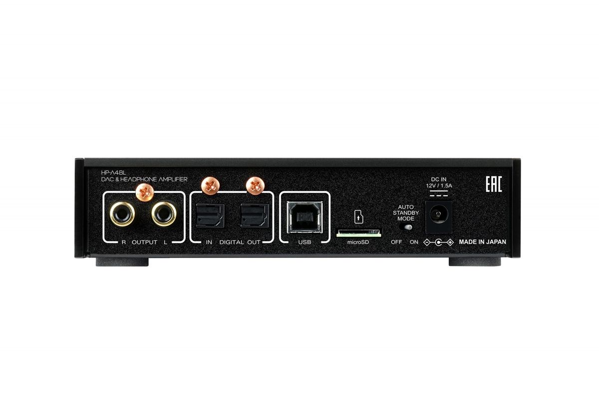 Цифроаналоговый преобразователь и усилитель для наушников Fostex HP-A4BL заключен в небольшой металлический корпус черного цвета, на передней панели – накладка из стекла. На нижней стенке обнаруживается заветная надпись Made in Japan, в последнее время уже нечасто встречающаяся на аппаратуре среднего ценового диапазона. Для подачи сигнала предусмотрены только цифровые входы, включающие USB 2.0 и оптический разъем. Зато выходов гораздо больше – есть линейный на RCA, а также балансный выход с усилителя для наушников на XLR и несимметричный для джека 6,3 мм. Присутствует и цифровой оптический выход.