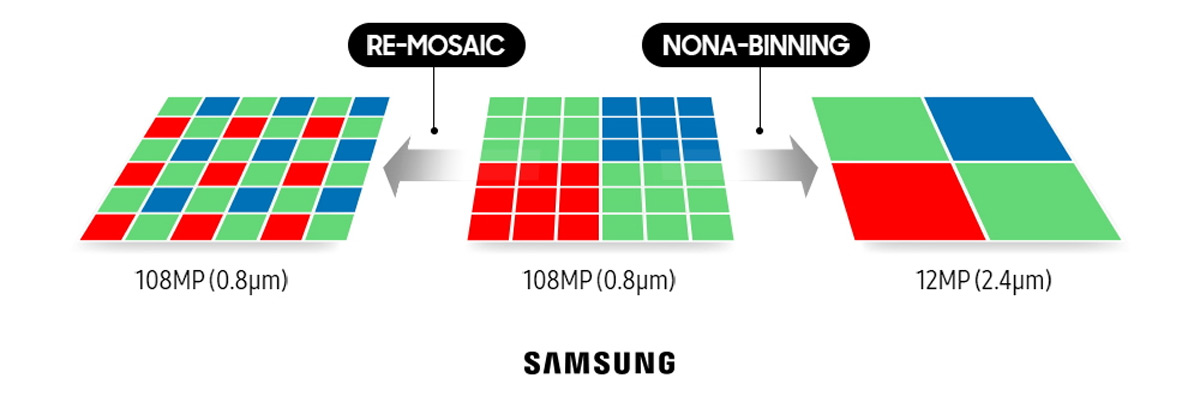 Работая над камерой Samsung S20 Ultra, инженеры пошли еще дальше: в ней используется матрица которая позволяет динамически переключаться между технологиями Nona-Binning и Re-Mosaic. Технология Nona-Binning объединяет девять пикселей в один, благодаря чему матрица с разрешением 108 МП позволяет получать фотографию с разрешением 12 МП. Поскольку размер пикселей за счет использования этой технологии увеличивается, матрица способна получить больше света, что позволяет повысить четкость фотографии даже когда света не хватает. Технология Re-Mosaic позволяет изменить традиционный порядок RGB точек для повышения детализации снимков при ярком освещении. Режим съемки можно менять, выбирая разрешение 108 МП в меню быстрых настроек (Быстрые настройки: Камера > Фото > Соотношение > 108 МП).
