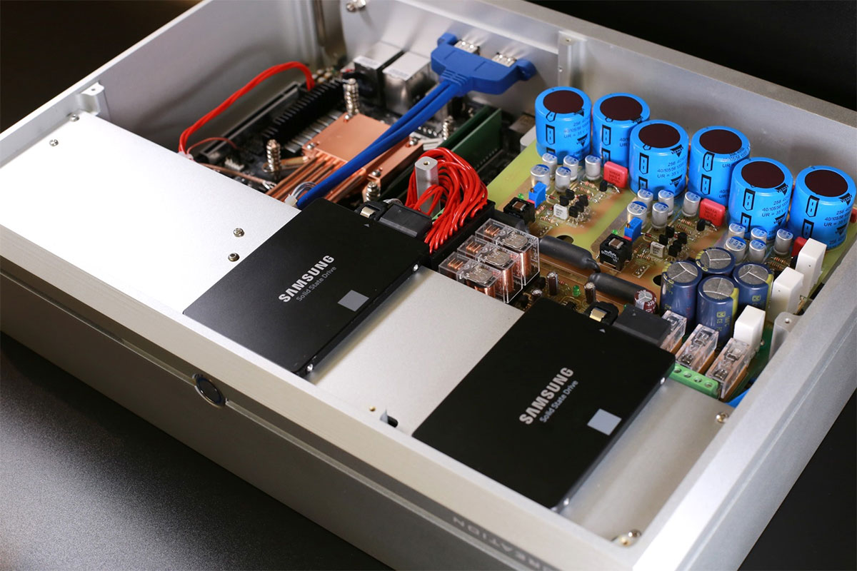 Аудиосервер N&E Audio Bach построен на базе процессора Intel Xeon и специализированной серверной материнской платы с двумя сетевыми портами Ethernet. Объем оперативной памяти составляет 16 ГБ, что более чем достаточно для возложенных на компонент задач, а вот ёмкость дисковых накопителей можно варьировать. Если в базовом варианте дисковая подсистема сервера предлагает два накопителя SDD ёмкостью 1 ТБ каждый, то под заказ возможна установка хранилища объемом до 8 ТБ. Кроме того, N&E Audio Bach поддерживает внешние накопители с интерфейсом USB, а также может использовать внешнее сетевое хранилище, организованное на базе NAS.