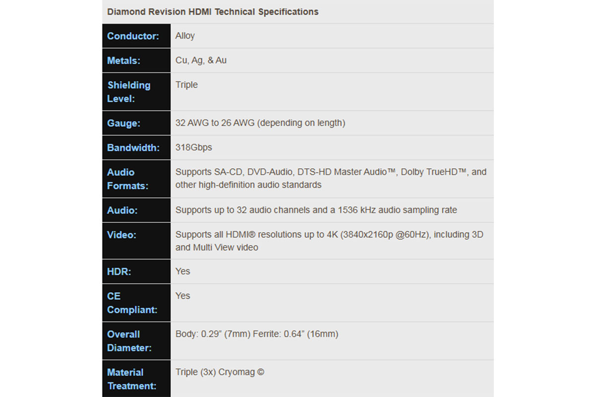 В кабеле Purist HDMI Diamond Revision применяются проводящие жилы из сплава меди, серебра и золота с тройным экранированием. Их сечение варьируется от 26 до 32 AWG в зависимости от длины изделия. Новинка поддерживает все необходимые для высокоскоростного HDMI функции: кабель обеспечивает полосу пропускания 18 Гбит/с, поддерживает канал Ethernet, обратный аудиоканал eArc, Deep Color, видео с расширенным динамическим диапазоном HDR (High Dynamic Range), протокол управление бытовой электроникой CEC, многоканальное HD-аудио и протокол защиты контента HDCP самой свежей версии. В результате, он способен транслировать видео 4K (3 980 x 2 160p) с частотой обновления кадров 60 Гц. Кроме того, HDMI Diamond Revision поддерживает все версии 3D-видео.