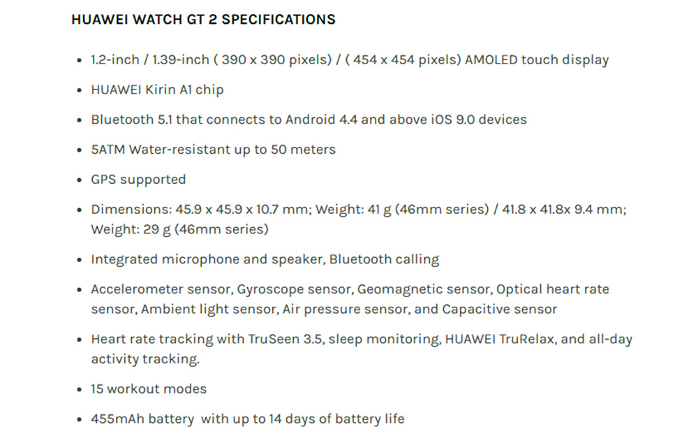 Гаджет будет оснащаться приёмником GPS, адаптером беспроводной связи Bluetooth и динамиком. Сообщают о возможности беспроводной зарядки аккумулятора часов. При этом, время автономной работы Huawei Watch GT2 Pro сможет достигать двух недель.