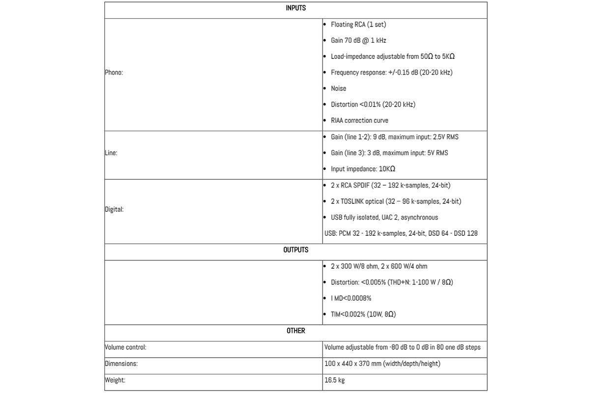 В арсенал интегрального усилителя Aavik U-380 входят два отдельных блока ЦАП для обработки цифровых потоков PCM и DSD, а также дискретный фонокорректор. Кроме того, для подключения аналоговых источников сигнала предусмотрены три линейных входа.