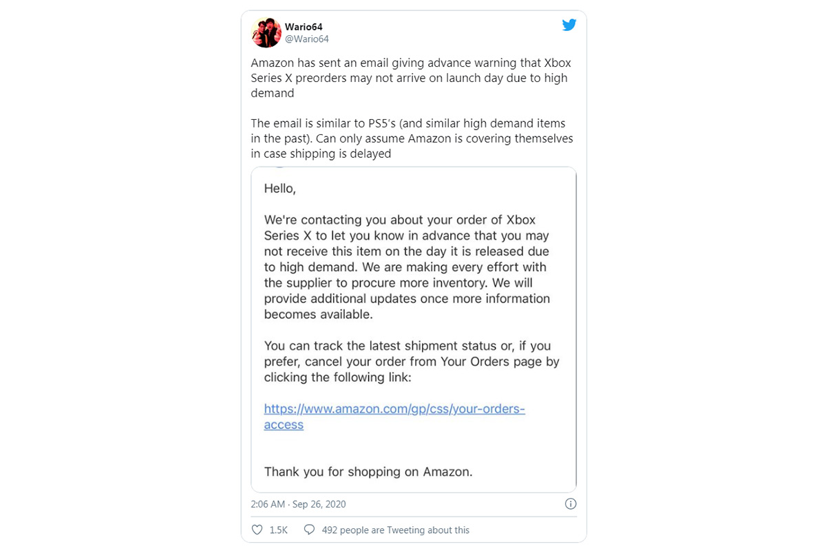 Thu, 28 Apr 2022 04:19:58 +0300 Thu, 28 Apr 2022 04:19:58 +0300Крупнейший американский онлайн-ритейлер Amazon прислал своим клиентам, сделавшим предварительный заказ на игровую консоль нового поколения Microsoft Xbox Series X, уведомление, что отгрузка гаджета не сможет быть проведена в день выхода новинки в продажу. Не так давно аналогичное сообщение было разослано относительно новой версии консоли Sony PlayStation 5. Amazon пишет в Twitter: «Мы связываемся по поводу вашего заказа на Xbox Series X, чтобы сообщить заранее, что вы можете не получить этот продукт в день выпуска из-за высокого спроса».