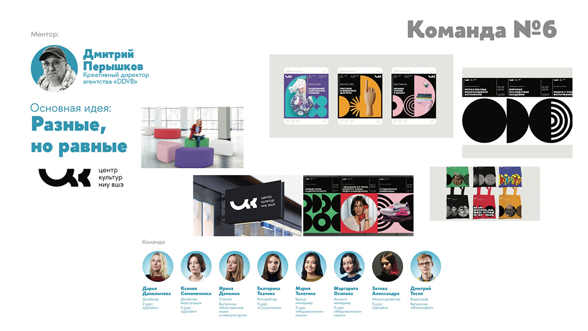 О конкурсе: в начале учебного 2019/2020 года студентам НИУ ВШЭ было предложено принять участие в создании бренда «Вышки» для собственного культурного центра. По итогам предварительного отбора среди студентов, подавших заявки на участие и прошедших предварительные творческие конкурсы, члены жюри сформировали восемь команд и назначили менторов из числа российских предпринимателей в области рекламы и маркетинга, креативных директоров международных рекламных агентств и представителей корпораций и крупных компаний-производителей, занимающих лидирующие позиции на российском рынке.