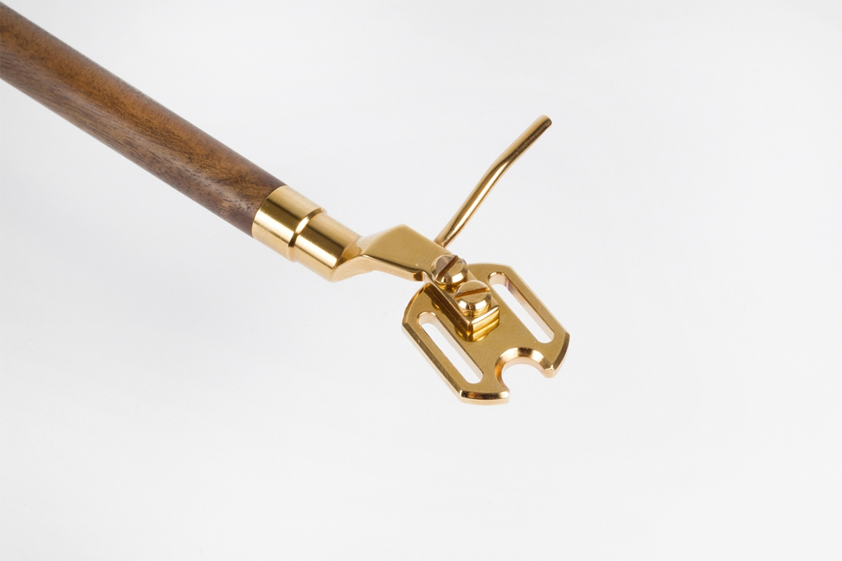 Auris Tangenta Hawk, фотографии которого вы видите, выполнен из латуни с покрытием 24-каратной позолотой. Трубка тонарма выполнена из натурального американского ореха. Тонарм предлагается в трех версиях, выполненных и из разных материалов, и четырех размерах: 9, 10, 12 и 14 дюймов. В конструкции реализованы регулировки VTA в диапазоне 10 мм и азимута в пределах 6 градусов. В базовом варианте тонарм комплектуется выходными разъемами с позолоченными контактами, но по желанию заказчика они могут быть заменены серебряными разъемами WBT.
