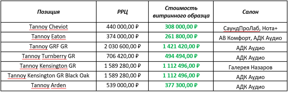 Имейте в виду, что условия акции распространяются только на те позиции, которые указаны в таблице, и действуют только там, где указано в таблице. Самый большой запас витринных образцов представлен в салоне АДК Аудио в Милютинском переулке – если вы не уверены в выборе, начните свои поиски оттуда.
