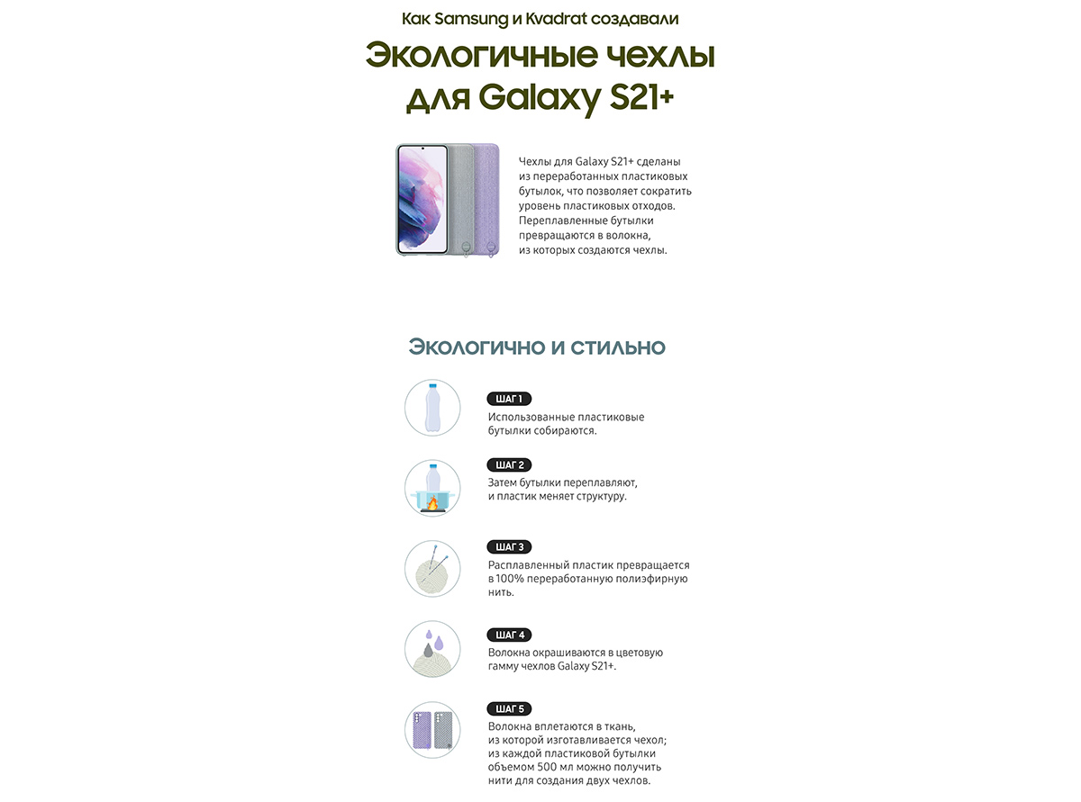 В инфографике вы найдете подробности о новейших стильных и экологически чистых чехлах для телефонов Samsung, доступных в двух эксклюзивных оттенках: фиолетовом и мятно-сером.