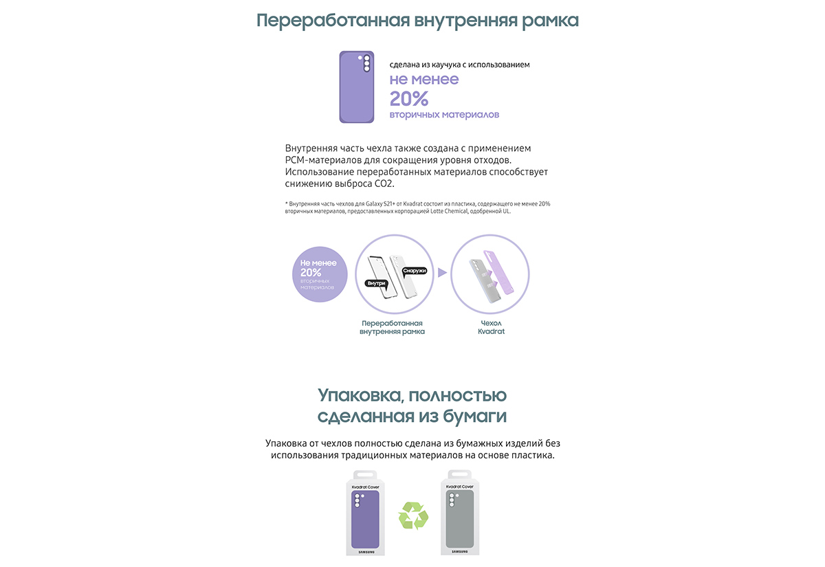 Новые чехлы, созданные Samsung совместно с Kvadrat для Galaxy S21+, не стали исключением. Как внешняя, так и внутренние части этих аксессуаров, а также крючки на них изготовлены из переработанных материалов с помощью экологически чистых методов производства. Универсальные крючки помогают пользователям подчеркнуть свой стиль, прикрепив брелок или другую подвеску к ремешку. Кроме того, новые чехлы поставляются в упаковке, полностью сделанной из бумаги.