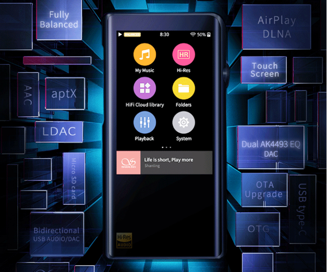Модель оснащена двумя выходами на мини-джек – обычным 3,5 и балансным 2,5 мм, ее также можно использовать как внешний ЦАП при подключении по USB. Беспроводное соединение возможно по Wi-Fi или Bluetooth, с поддержкой кодеков LDAC, AAC и aptX. Встроенная батарея имеет объем 3400 мАч. Любопытно, что в плеере нет собственного хранилища, есть только слот для карт MicoSD или Micro SDXC объемом до 512 ГБ.