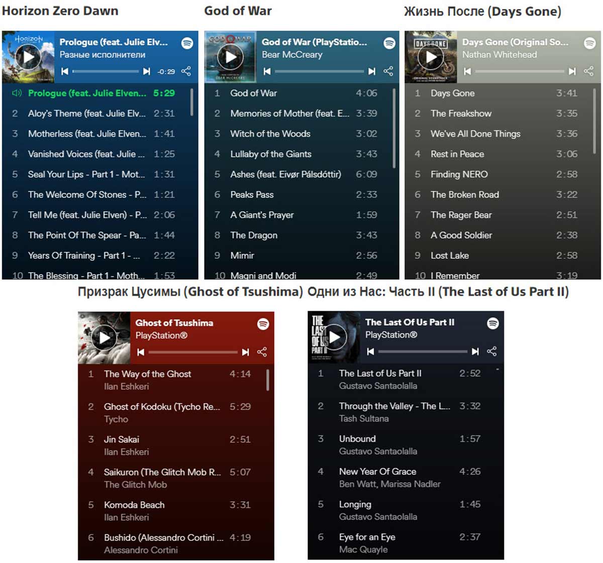 Используйте приложение Spotify на PS4 и PS5 и слушайте саундтреки из любимых игр! Вот лишь некоторые примеры альбомов и плейлистов, которые ждут вас в сервисе: