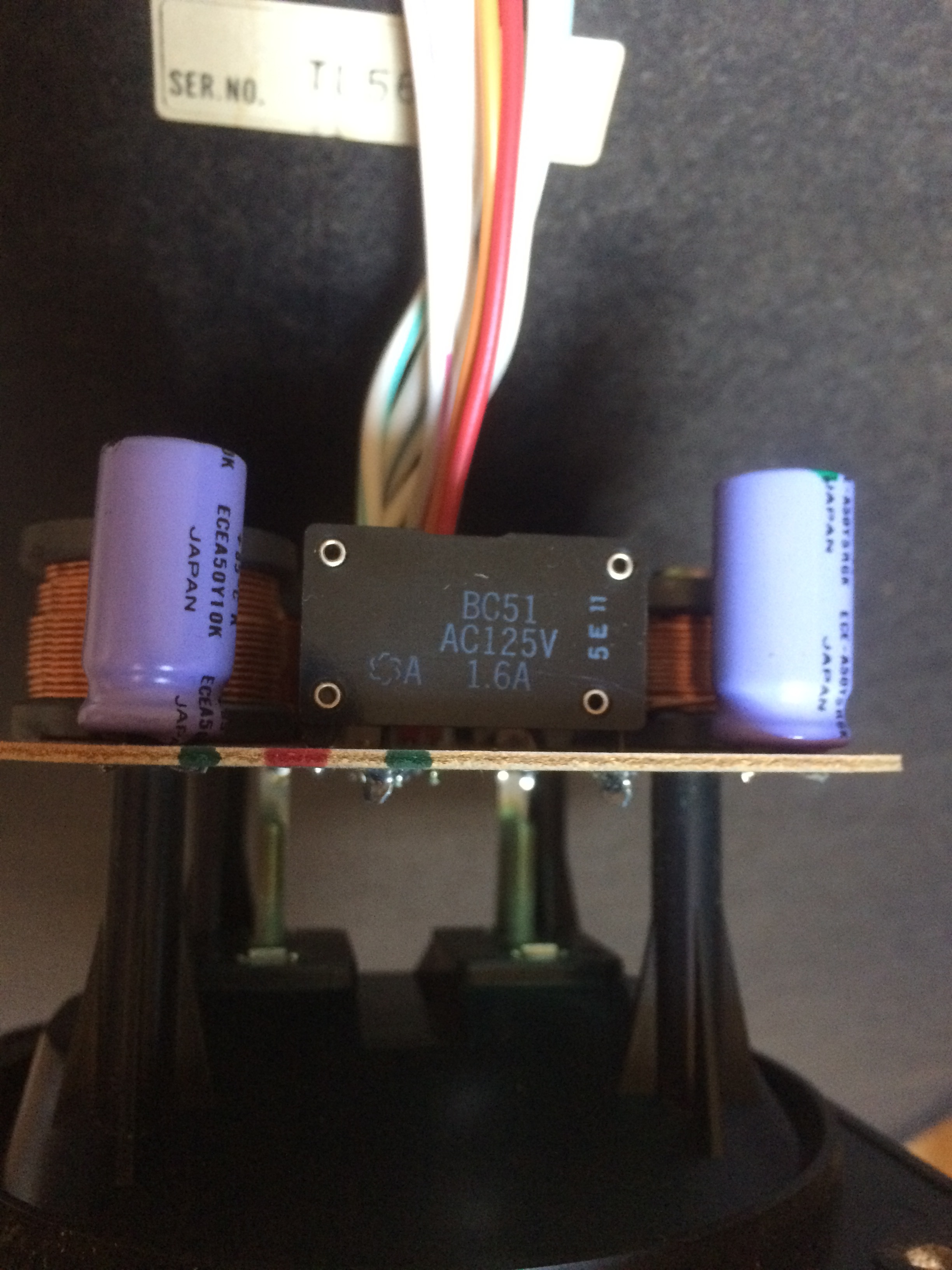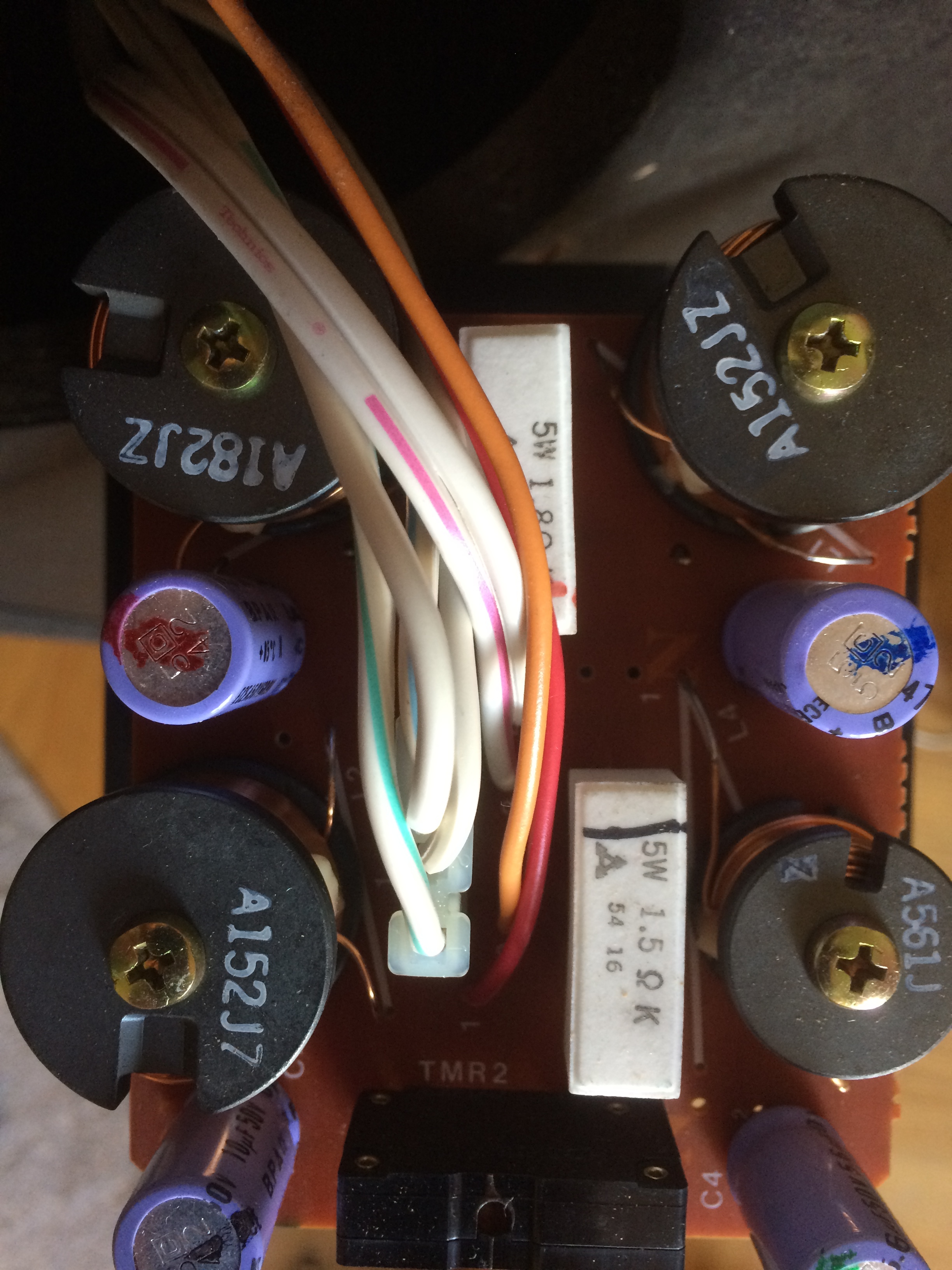 Выкрутил конектор на котором прикреплена плата фильтра, потрогал проводку возле фильтра. Отделил фишку с проводкой идущей к СЧ и ВЧ регуляторам все контакты блестят красивые, фишку вставил обратно. Потрогал все детали на фильтре, там есть 4 конденсатора, 4 катушки, 2 сопративления, 1 деталь обозначение на плате TMR 1- это наверно называется темитор. Все детали жестко прикреплены к плате, сама плата выглядит никаких видимых дефектов. Подал сигнал на колонку и потрогал темитор имитируя