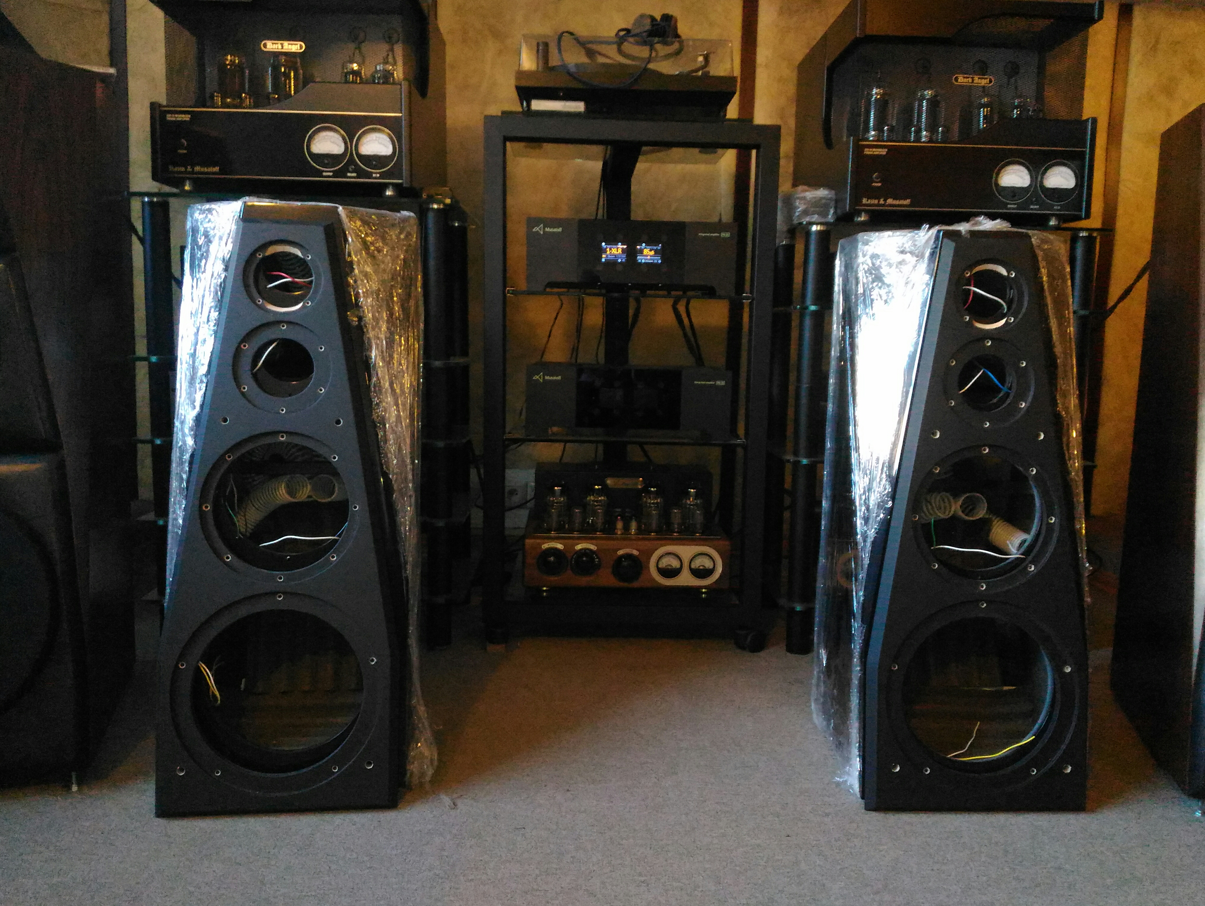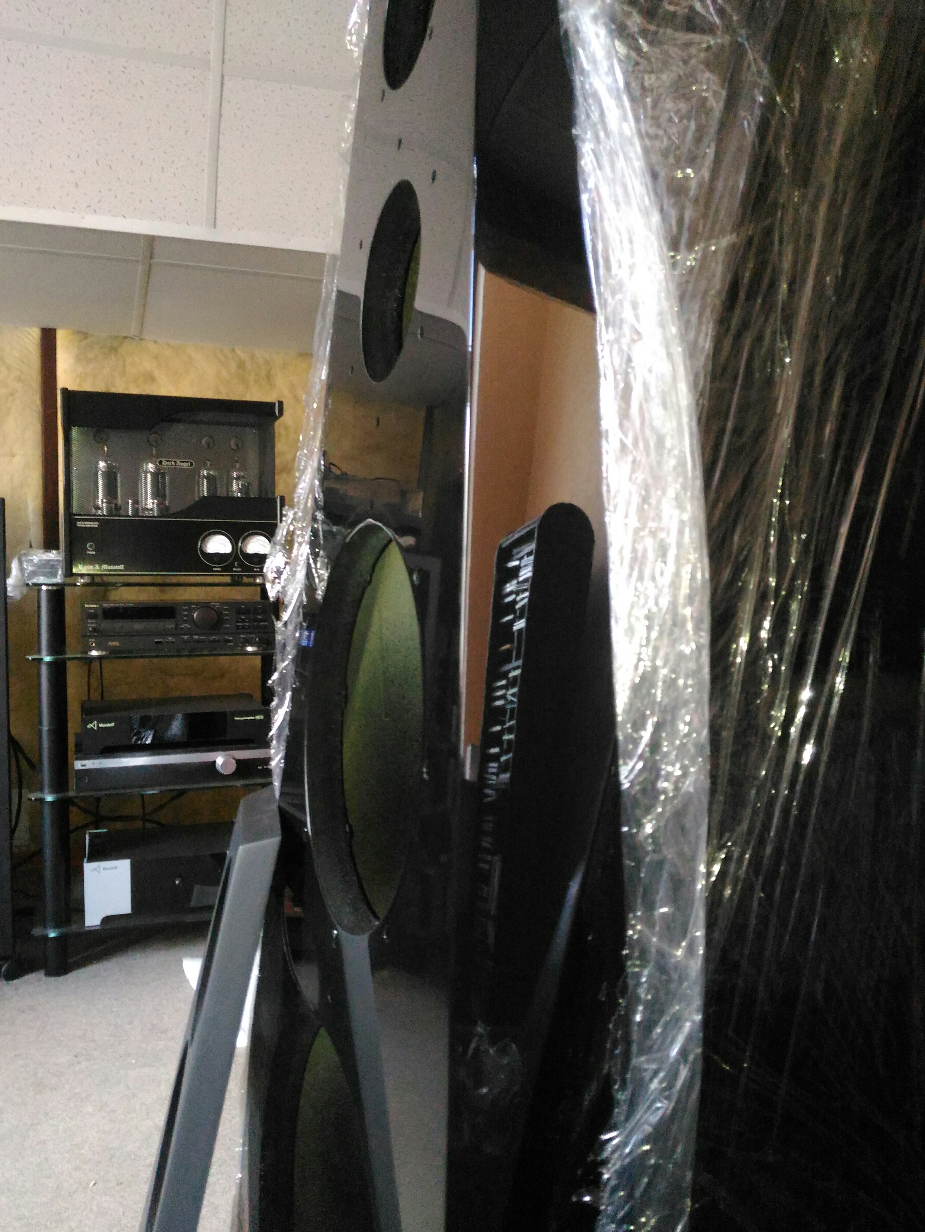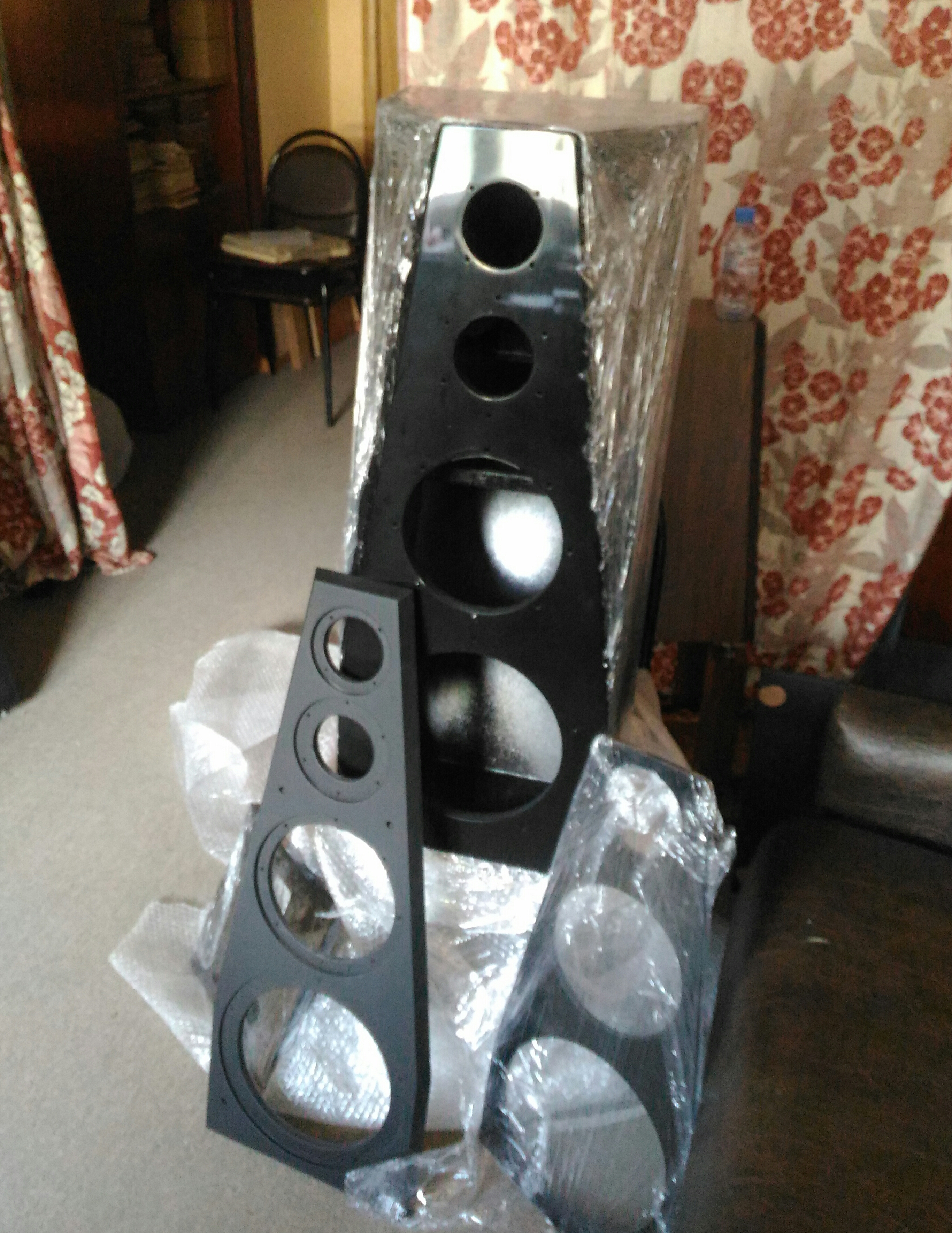 Пришли новые корпуса для вертикальны напольных AS-10 10-й версии. Они в черном глянцевом лаке, потому затянуты пленкой для защиты.