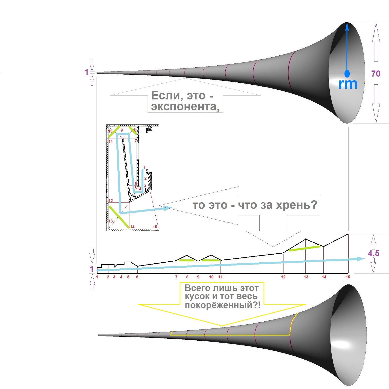 Можно подумать, что там, кто то параметры учитывал: Если уж на Westminster они этого не делали: Из раза в раз, как только пишешь о реальном положении дел (аргументированно, доступно и подробно иллюстрированно, так, чтоб даже дошкольник понял), в ответ, от всё тех же, заинтересованных лиц (упёртость коих, поражает) получаешь поток , всё той же замшелой маркетинговой мифологии. Вот, кому, нужна подобная конструкция, не имеющая ничего общего с экспонентой. А являющаяся всего лишь слегка расширяющейся ( причём, с резкими изменениями сечения, что вообще противопоказано рупору) покорёженной трубой, представляющий из себя, не пойми какую нагрузку для динамика. И это у модели RHR (Limited Edition - всего 111 пар . . . бла-бла-бла) с "зеркалами" (показаны зелёным). А у всех остальных - как Windsor, даже этого нет. Действительно, ни Limited, ни Edition - фиг ли их туда ставить?! Так и разориться недолго! Но, по большому счёту, дело даже не в этом, а в слишком малых размерах устий у всех без исключения "рупорных" АС от Tannoy. А ведь, именно от размеров устья, зависит частота среза рупора: Кому не лень, посчитайте и задумайтесь над тем - кому нужны эти рупоры бубнящие на мидбасе - нижней середине?! Формула: rm = с /(2 x pi х FC) Где: rm - радиус устья с - скорость звука (34290 см/сек.) FC - частота среза рупора Таким образом, для того, чтоб получить Fc=30Hz, rm = 182cm Не зря существует (английская) поговорка: - If you want athing well done, do it yourself. - Хочешь, чтоб было сделано хорошо - сделай сам. А известная песня Семёна, далеко не только об отечественных изделиях: Сколько можно жить по по "принципу" - Credo quia absurdum.