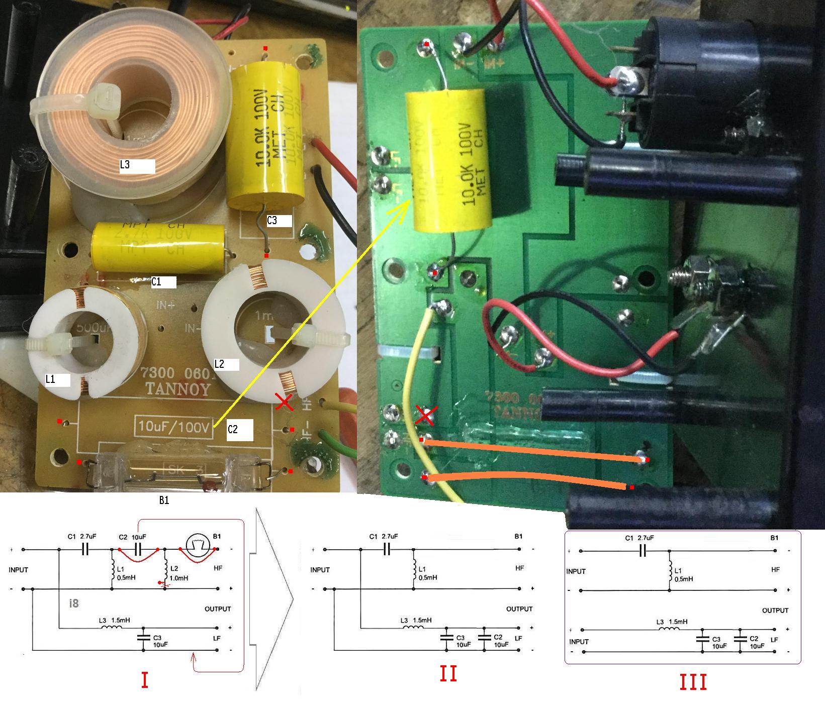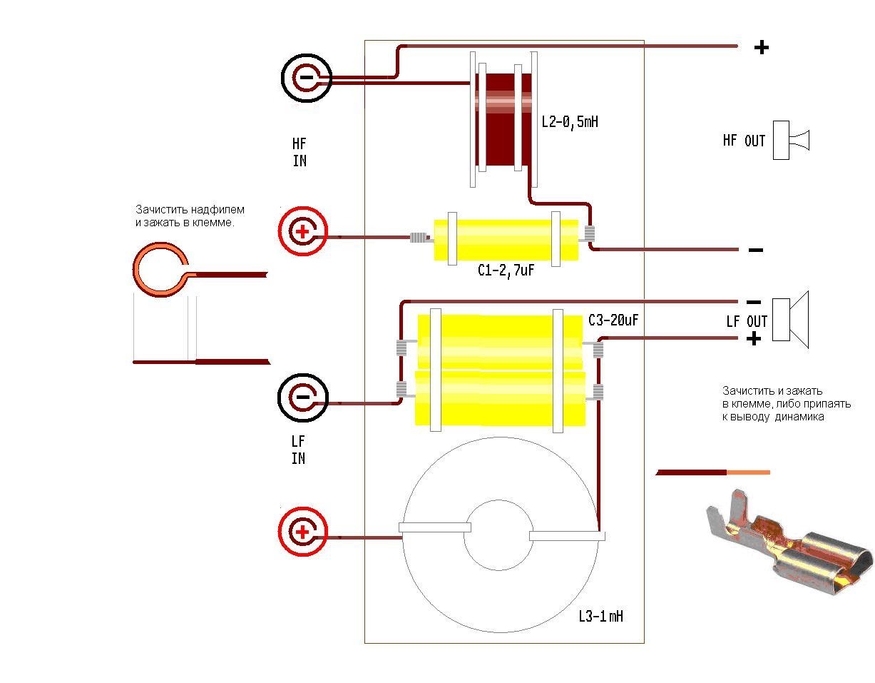 Кстати, у кого есть L/C метр, или мультиметр, с функцией L/C, тому бы я посоветовал, не менять местами катушки, а изменить их. А именно: L3 -1,5mH (с её толстым проводом, что очень важно для НЧ) размотать и намотать снова, но уже номиналом 1mH, оставив с обоих концов выводы, спокойно дотягивающиеся, один до клеммы терминала, другой до клеммы динамика. Такую же процедуру совершить с катушкой L2-1mH, сделав её номинал равным 0,5mH и заменив ею катушку L1. Кроме того, в качестве "-" проводника на НЧ, использовать кусок провода от L3. Все детали, разместить, закрепить и подсоединить друг к другу, точно, как указано на рисунке нового кроссовера ниже) на дощечке из фанеры, или МДФ.