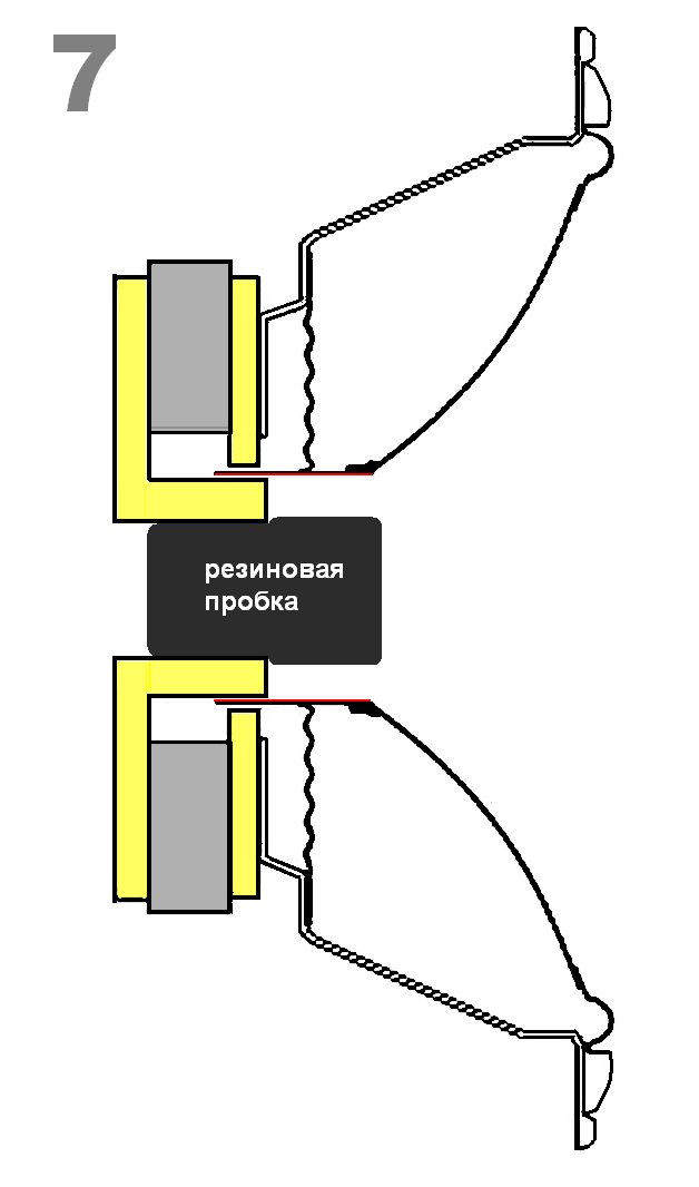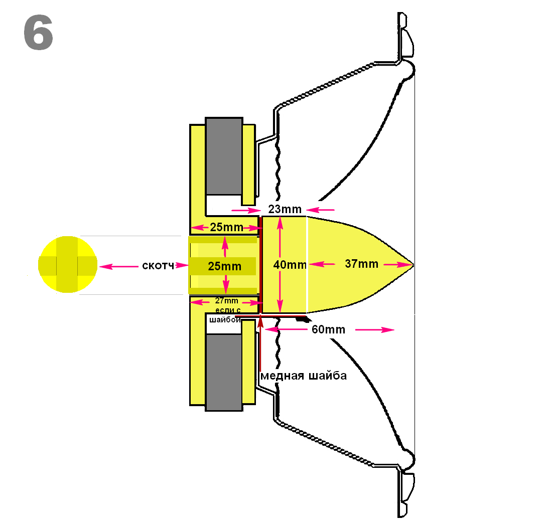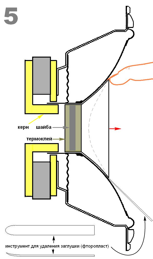 И начать надо с замены этих заглушек (сидящих на чёрном герметике) на фазовыравниватели (см. картинки 1, 2 и 3). Инструмент из фторопласта (см. картинку 5) нужен чтоб не поцарапать чёрную краску диффузора. Хотя, некоторые и ногтями справляются. А пока будете вытачивать фазовыравниватели, просто заткните чем ни будь подходящим отверстие в керне (см. картинку 7). После перейдём к кроссоверу. P.S. Пока ничего покупать не надо. Разве что катушку с воздушным сердечником, номиналом 0, 47mH или 0,5mH