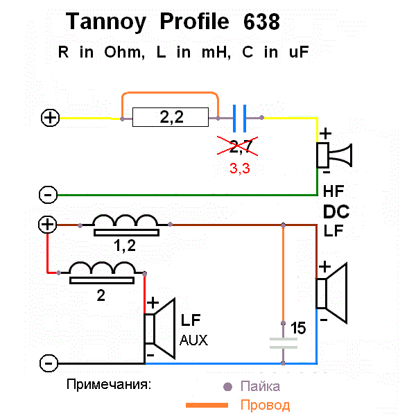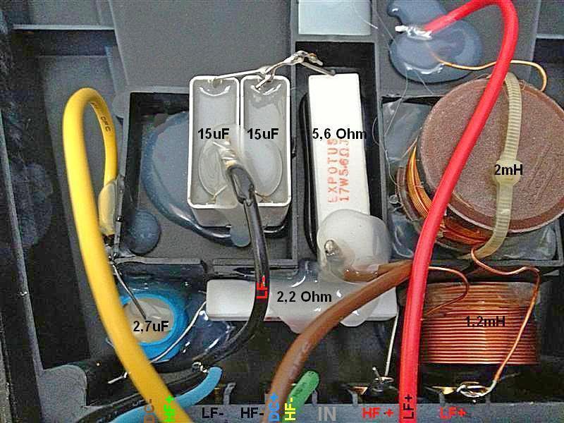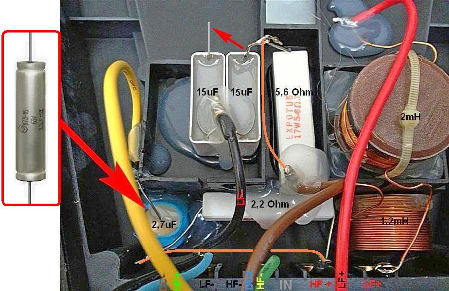 В результате чего остаётся один серый конденсатор (15uF). В фильтре ВЧ, параллельно имеющемуся конденсатору 2,7uF припаиваем (шунтируем) конденсатор 0,68uF, в результате чего получаем номинал 3,38uF. Если Вы купили пару конденсаторов 3,3uF (как я вчера просил), то просто замените на один из них, оригинальный (синий) конденсатор номиналом 2,7uF. А резистор номиналом 2,2 Ohm шунтируйте куском провода, припаяв его параллельно резистору, как указано на схеме ниже.