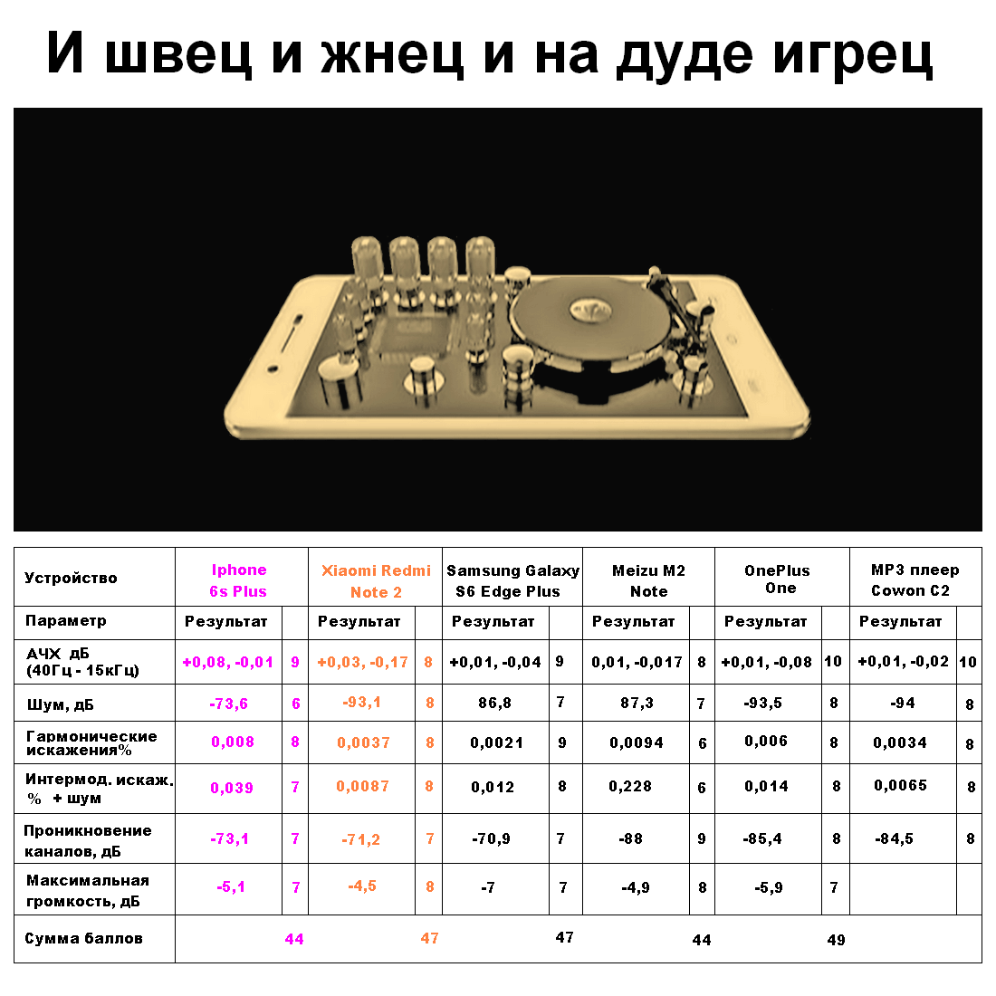 P.S. Нашёл таблицу с измерениями аудио тракта смартфонов. С Iphone 6s Plus иXiaomi Redmi Note 2. Начинка первого такая же как уSE,а второго как у Mi Max. И в очередной раз убедился, что подобные изменения, ничего не говорят о реальном качестве звучания музыки.