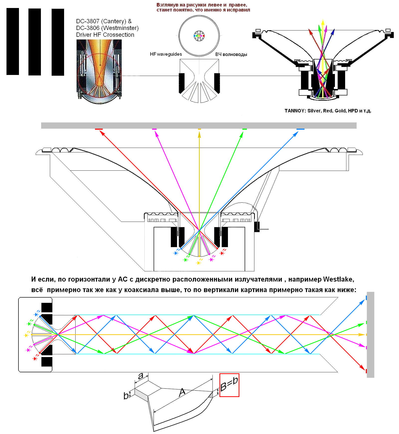 в) для плоских по вертикали (с параллельными стенками!!!) и весьма длинных рупоров, как к примеру у Westlake, понадобятся ещё и зеркальные (верхняя и нижняя) стенки рупора. Дабы убедиться, что последним, ввиду их геометрии, никакая конструкция волноводов не поможет.