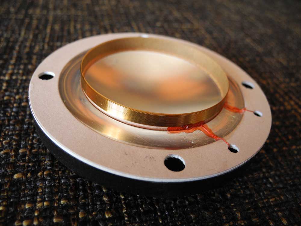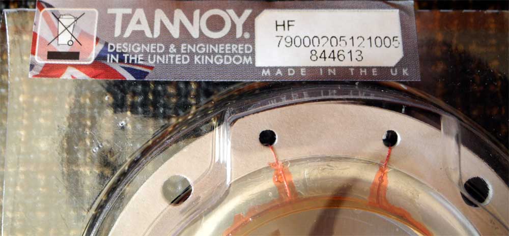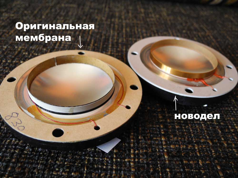 На днях я получил пару этих новеньких мембран, и что смущает : во-первых она очевидно отличается намотанным проводом, да и конструктивно у новой мембраны нет припаянных к катушке выводов, см. фото. во-вторых, ярлычок на твитере с совсем уж свежей датой 3/10/12 в-третьих, сопротивление новых катушек оказалось несколько меньше : 9,5 и 9,7 Ом против 10,3 Ом у оригинальной.